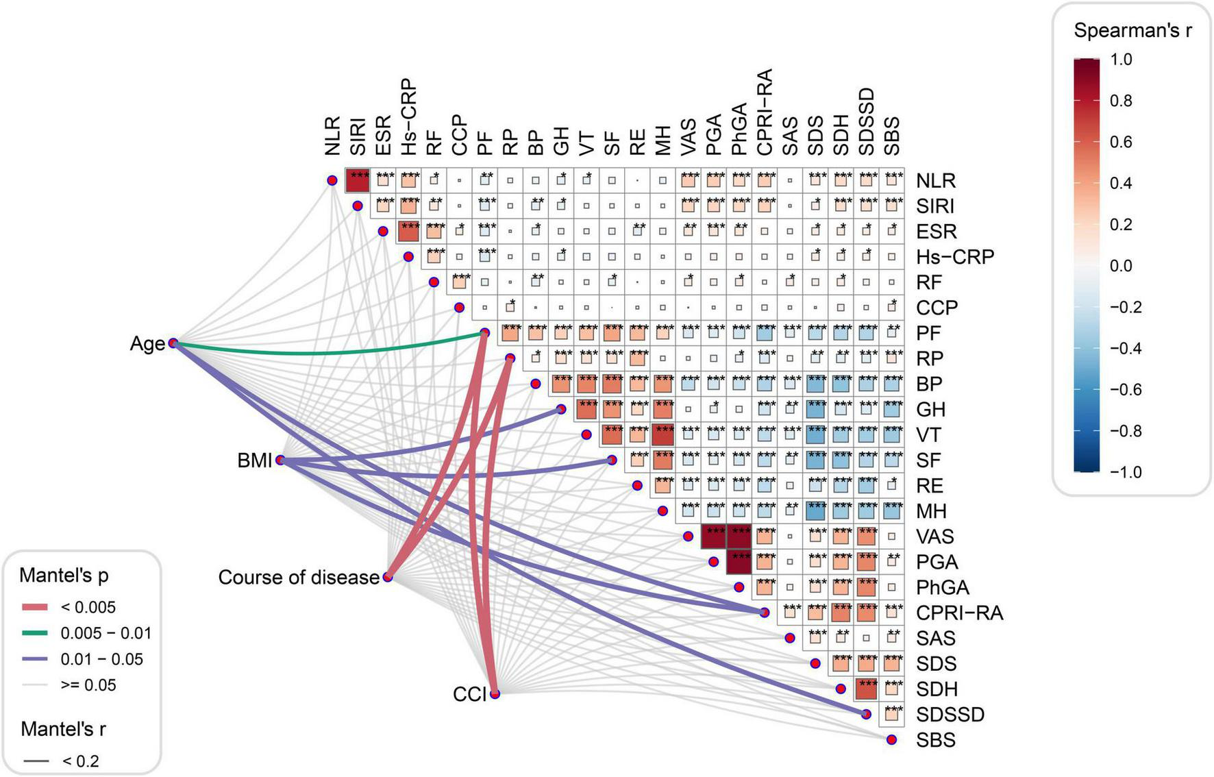 The Mantel test is a method proposed by Nathan Mantel to determine the correlation between 2 sets of distance measurement matrices (33). We used Spearman’s correlation analysis and Mantel’s test to examine the correlations between all inflammation indicators and SPP outcomes and baseline variables, and to generate correlation matrix heat maps and networks. These were achieved in R 4.3.2 by utilizing the “linkET” and “ggplot2” packages.
