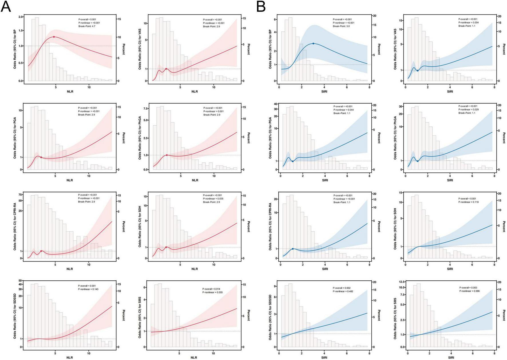 To examine the dose-response relationship (linear or nonlinear) between systemic inflammatory outcomes and SPP outcomes, we performed Restricted Cubic Spline (RCS) regression analyses of NLR, SIRI, and SPP each score. The dependent variable, SPP each score, was converted from a continuous variable to a dichotomous variable based on threshold or median. The RCS curves were plotted through logistic regression models where the number of nodes was determined based on the Akaike Information Criterion (AIC) minimum. We implemented this model by utilizing the “rms” package in R 4.3.2.