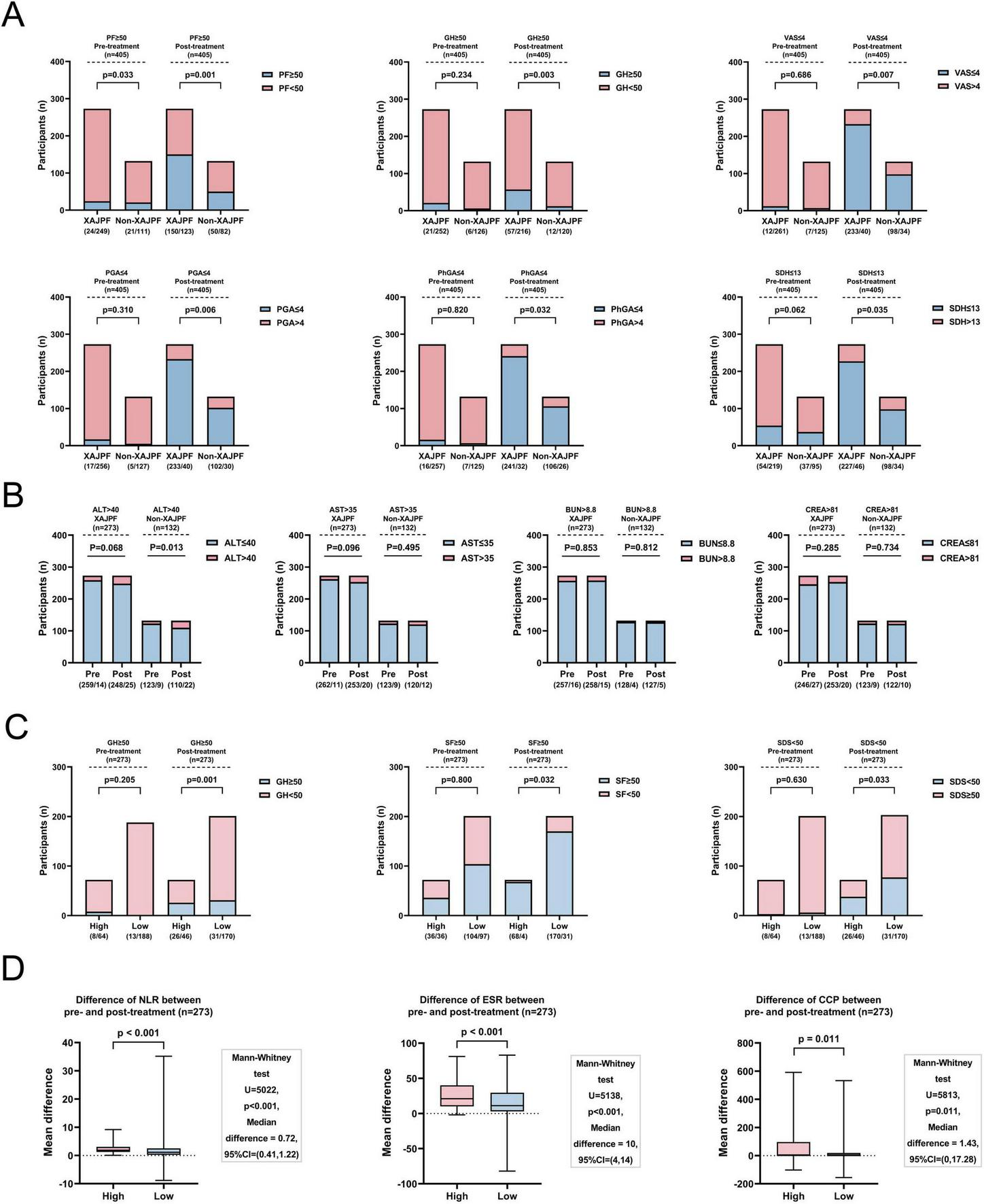 After matching, baseline characteristics were balanced between groups. Higher inflammatory status was associated with worse SPP scores. Compared with the non-exposure group, XAJPF exposure demonstrated superior efficacy in improving SPP outcomes and systemic inflammation levels, without causing hepatic or renal injury. Multivariable-adjusted logistic regression identified XAJPF as an independent protective factor against worsening PF, GH, VT, MH, VAS, PGA, PhGA, CPRI-RA, SDS, SDH, and SDSSD, with odds ratios of 0.24, 0.60, 0.54, 0.50, 0.44, 0.46, 0.54, 0.56, 0.43, 0.29, and 0.49 (all P<0.05), with exposure-response relationships observed. Mediation analysis indicated that NLR and SIRI mediated 5.1–14.4% of XAJPF’s improvement effects on VAS, PhGA, and SDSSD scores. Subgroup and sensitivity analyses underscored the robustness of these effects.