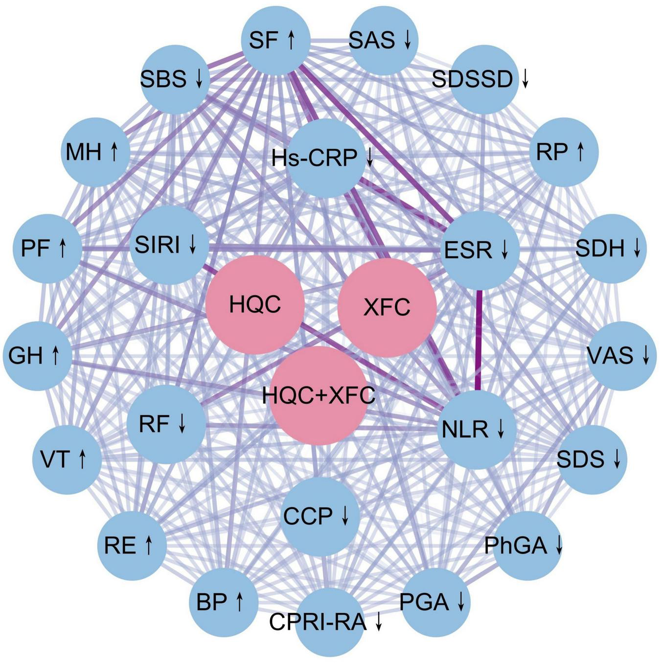 The fragmentation of traditional inflammatory markers from the subjective experience of patients has long constrained the scientific interpretation of the efficacy of TCM in RA. Based on the characteristics of inflammatory arthritis including RA, the International Consortium for Health Outcome Measurement (ICHOM) proposed a standardized outcome set for patients including pain, activity limitation, fatigue, and assessment of overall mood and physical health impact, and recommended its implementation globally (16). Self-perception of patients (SPP) is based on this standardized outcome assessment framework, integrating patient-reported outcomes (PROs) across multiple dimensions of overall function, somatic pain, disease activity, and health-related quality of life, and innovatively incorporating a TCM evidence-specific assessment system (17). A previous study by our group confirmed that RA patients commonly present SPP abnormalities in the form of anxiety/depression and reduced quality of life, the extent of which is significantly correlated with the level of inflammation and the state of disease activity (18). It is noteworthy that there remains a lack of composite outcome assessment systems that systematically integrate systemic inflammation with patients’ multidimensional self-perception. Therefore, the construction of systemic inflammation-SPP composite endpoints can more sensitively capture the multi-targeted efficacy characteristics of XAJPF, which is an important outcome indicator to measure the disease status of RA patients.