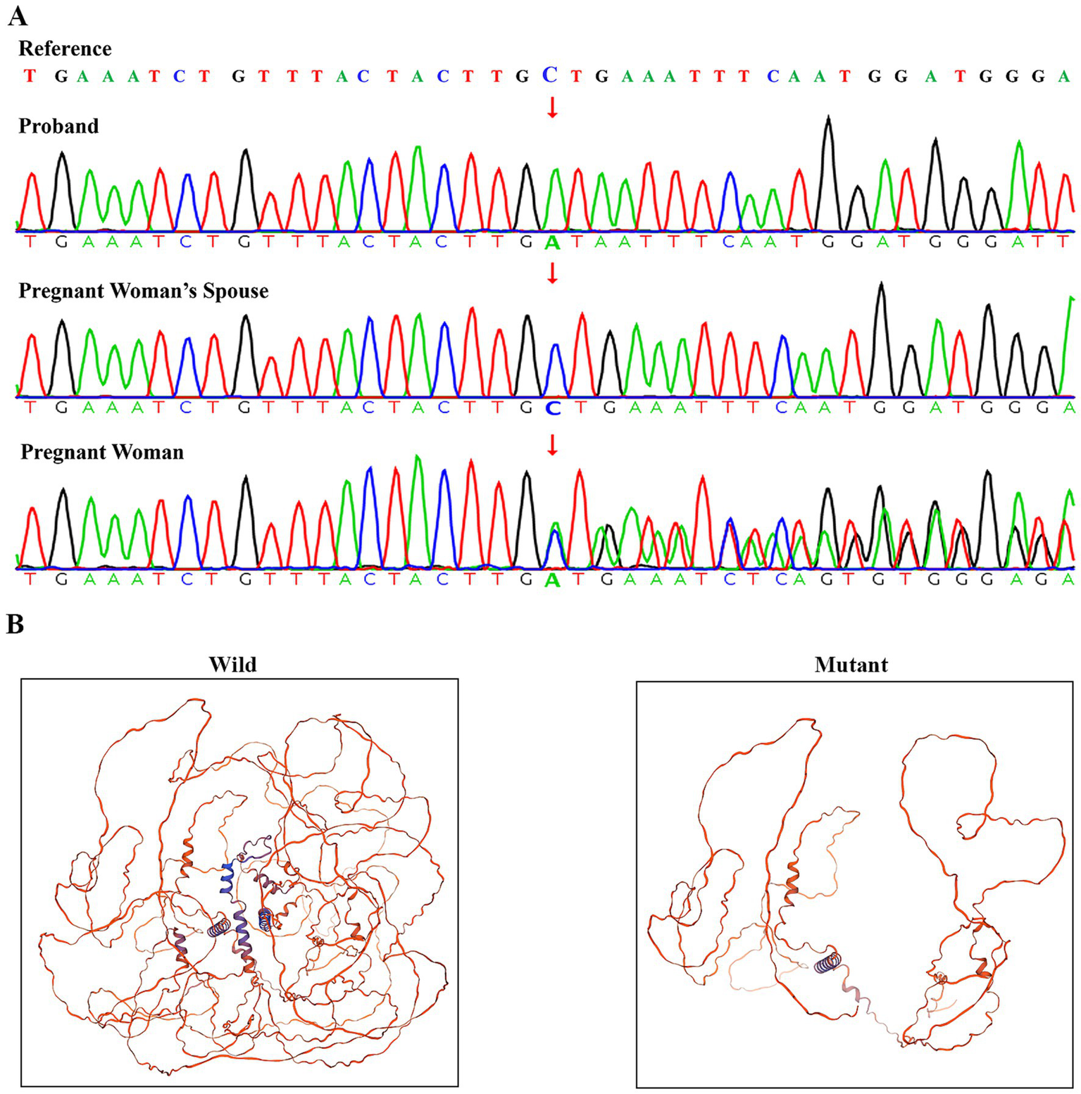 Figure 2. Verification and pathogenic structural analysis of the NEXMIF c.1939_1942delinsAT variant. (A) Sanger sequencing confirmation of the NEXMIF c.1939_1942delinsAT variant. (B) Comparative homology models of wild-type and mutant NEXMIF protein structures (c.1939_1942delinsAT) predicted using Swiss-model.