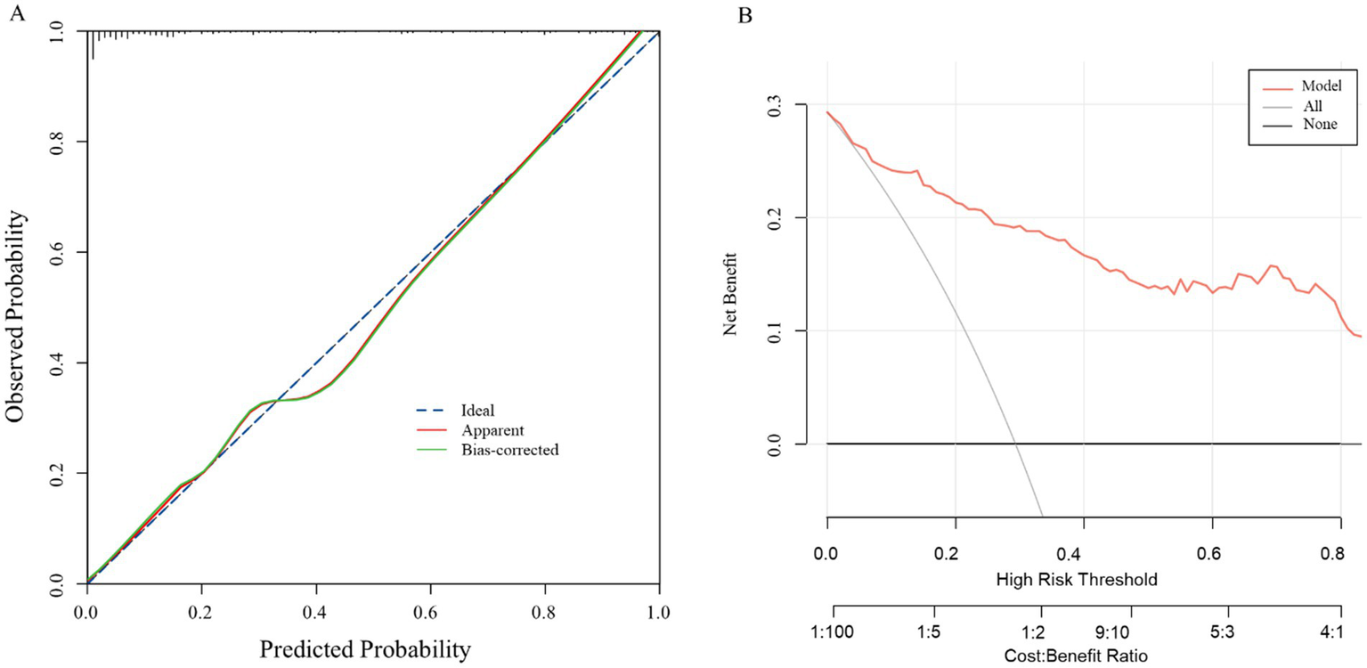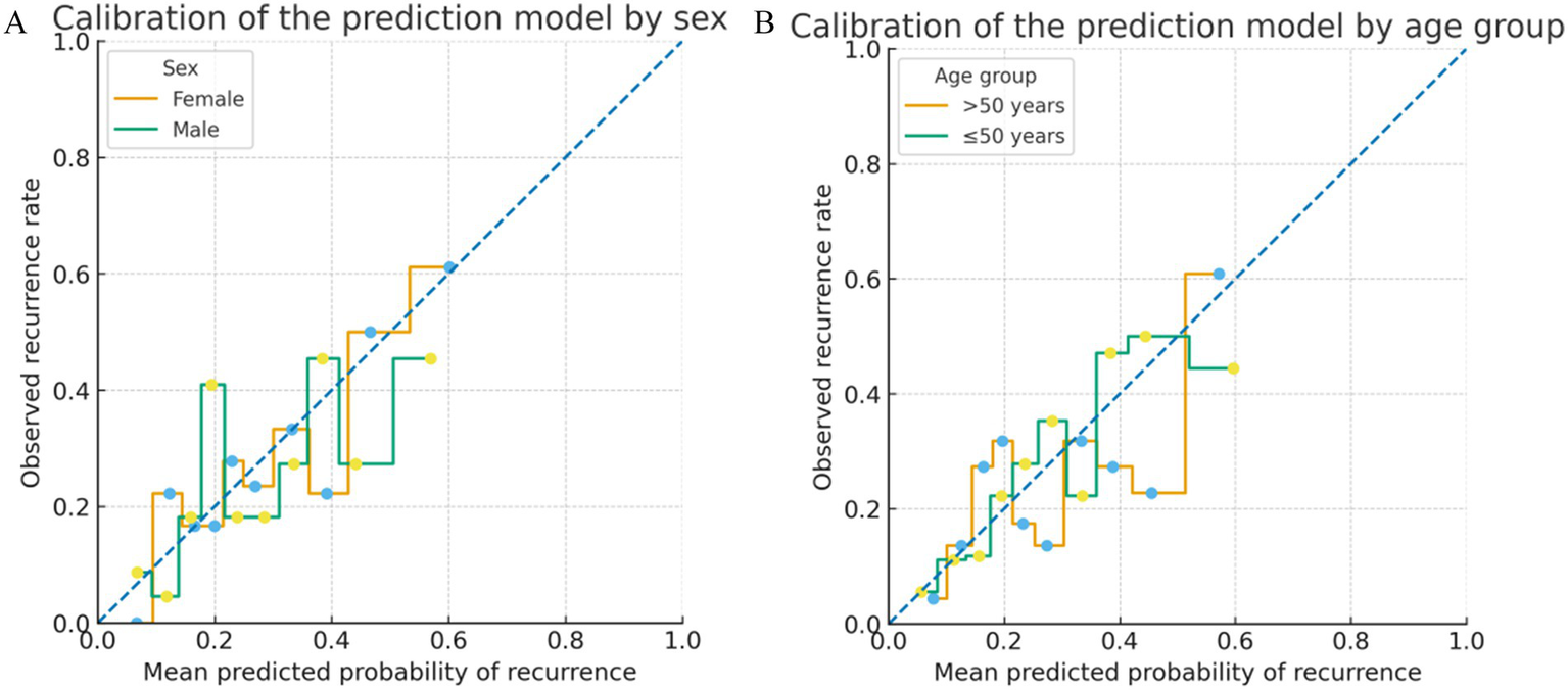 In exploratory analyses, we also assessed model performance in key sociodemographic subgroups defined by sex (male vs. female) and age (≤50 vs. >50 years) to explore the stability of discrimination and calibration across these strata. The performance of this prediction model was rigorously evaluated across three key domains: discrimination, calibration, and clinical utility. Discrimination, the model’s ability to differentiate between patients with and without recurrence, was quantified by the area under the ROC curve (AUC). Calibration, which reflects the agreement between predicted probabilities and observed frequencies of recurrence, was assessed visually using a calibration plot and supplemented with the Hosmer–Lemeshow goodness-of-fit test. The clinical net benefit of applying the model across a range of decision thresholds was evaluated using decision curve analysis (DCA). Finally, to account for inherent overoptimism and internally validate the model’s performance, bootstrap resampling with 1,000 replicates was performed, and a bias-corrected Harrell’s C-index was calculated and reported.