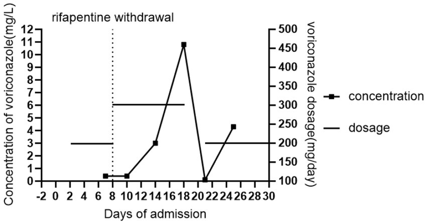 This case demonstrates a marked decrease in voriconazole trough concentration due to co-administration with rifapentine, with the interaction persisting for over a week after discontinuation. It is not advisable to increase the voriconazole dose immediately after rifapentine cessation to counteract this interaction. Moreover, therapeutic drug monitoring must continue even once target trough levels are achieved, as the waning induction effect can lead to supra-therapeutic exposure and toxicity. However, this case report has several limitations. First, the CYP2C19 genotype, which is a known factor influencing voriconazole concentrations, was not assessed. Second, the single-case design inherently limits the generalizability of the findings. Future studies should include and analyze multiple similar cases to strengthen the persuasiveness and robustness of the conclusions.