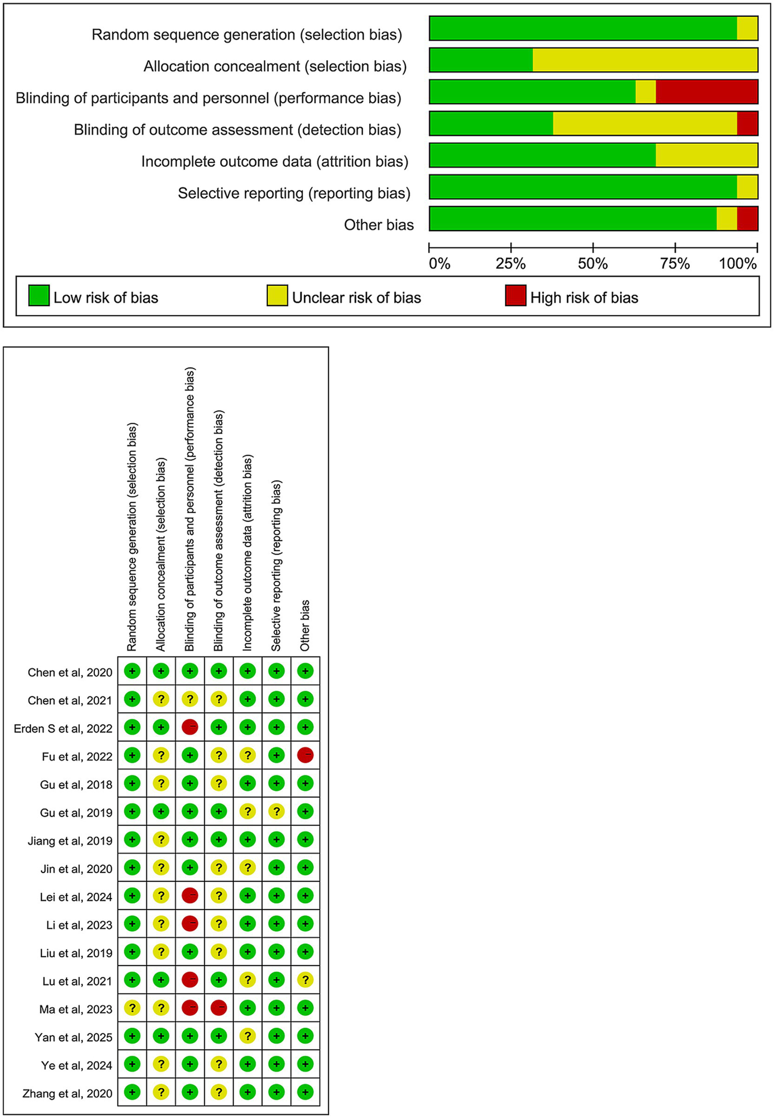 The Cochrane Risk of Bias (ROB) assessment tool was used to evaluate the risk of bias in the included randomized controlled trials (RCTs), with two researchers independently assessing each study. The evaluation covered seven domains: randomization process, allocation concealment, blinding of interventions, blinding of outcome assessment, completeness of outcome data, selective reporting, and other potential biases. Each domain was rated as “low risk,” “high risk,” or “unclear” based on the information provided in the studies.