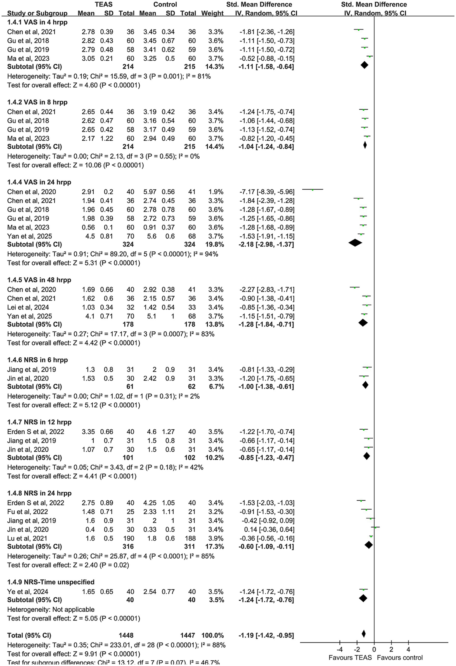 Table 2 summarizes the key characteristics of the TEAS interventions in the included studies, including the selected acupoints, stimulation duration, frequency, and current intensity. Commonly used acupoints included Neiguan (PC6), Zusanli (ST36), Hegu (LI4), and Sanyinjiao (SP6). Most studies initiated TEAS intervention 30 min before surgery, with some continuing during or after surgery. The electrical stimulation frequency was mostly in the form of sparse-dense waves, with the current intensity typically ranging from 2 to 30 mA. Most studies did not report any TEAS-related adverse events, though a few studies mentioned mild discomfort at the electrode site.
