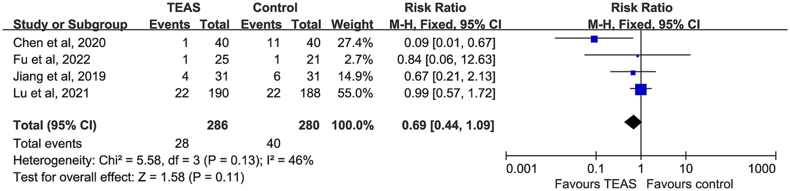 A total of 16 randomized controlled trials involving 2,017 postoperative cancer patients were included (1,125 in the TEAS group and 892 in the control group). Meta-analysis of 13 studies showed that TEAS significantly reduced postoperative pain scores (SMD = −1.19, 95% CI: −1.42 to −0.95, p < 0.00001). Eleven studies indicated that TEAS decreased the incidence of PONV (RR = 0.47.95% CI:0.37~0.61, P<0.00001). Four studies were included in the meta-analysis of postoperative nausea, showing a significant reduction in incidence in the TEAS group compared to controls (RR = 0.33, 95% CI: 0.22 to 0.49, p < 0.00001). Another four studies showed a downward trend in postoperative vomiting but without statistical significance (RR = 0.69, 95% CI: 0.44 to 1.09, p = 0.11).