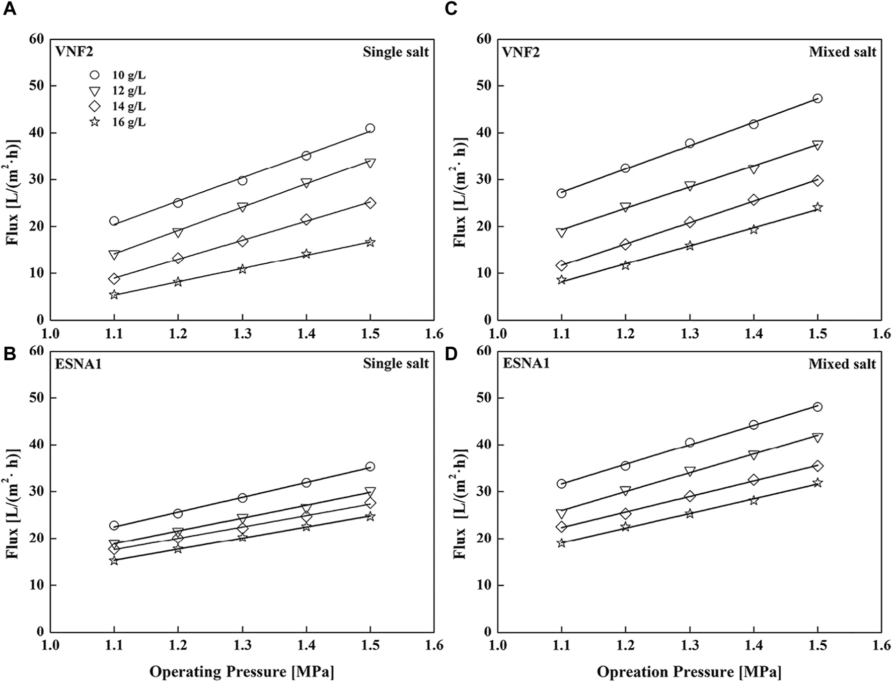 Figure 5. Effect of pressure on flux at 2 m3/h flow rate. NaCl feed solution (A, B) NaCl + MgSO4 feed solution (C, D) (source (Du et al., 2020).