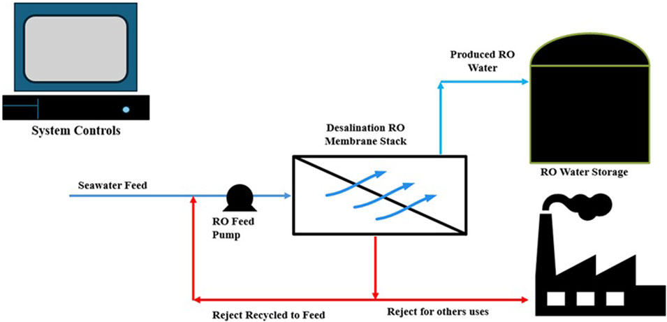 A pressure-driven membrane separation system comprises membrane modules that house membranes of flat, tubular, or spiral-wound configurations (Koros et al., 1996). Force is required to drive the feedstream through the membrane and result in the required separation or purification. Piping is required with the required components to control the various stream flow rates while transporting materials into dedicated tanks for each of the feed, permeate, and reject streams. Ancillaries include electricals, controls, sensors for measurements, and monitoring of process parameters, including flow, level, temperatures, pressures, and concentrations, to ensure the system operates within range while meeting product quality (Awerbuch et al., 2006). Some membrane systems are equipped with operational nuisance detection systems to detect membrane fouling and/or scaling and initiate necessary actions to maintain operational performance and longevity (Fortunato, 2020). Figure 2 shows a typical representation of a reverse osmosis (RO) membrane separation system.