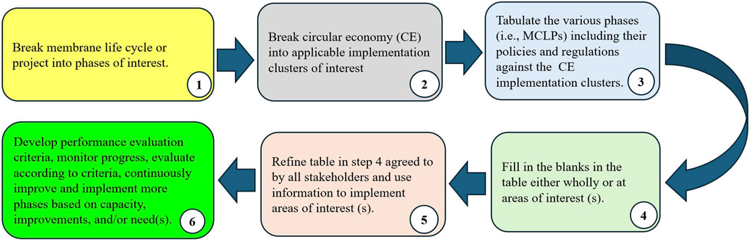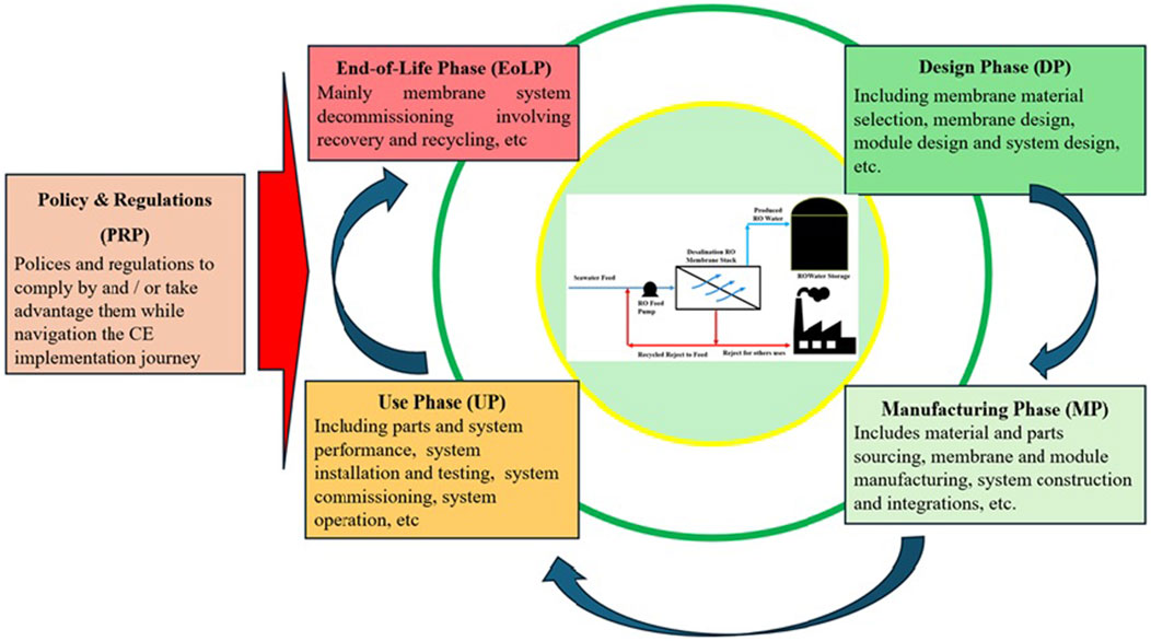 In general, the life cycle of pressure-driven membranes involved in separations is associated with material selection, membrane design, membrane fabrication, testing, membrane system design (Anim-Mensah, 2025), system construction and manufacturing, system installation, system commissioning, system operation, and decommissioning (Khanzada et al., 2024; Glover et al., 2022). This membrane life cycle in phases can be grouped into four groups: (1) design of the membrane and system; (2) production of the membrane and systems; (3) using the membrane and system; (4) end-of-life of the membrane and systems (König et al., 2024). In each phase, regulations and policies exist to assist in complying with CE principles to derive the necessary benefits.