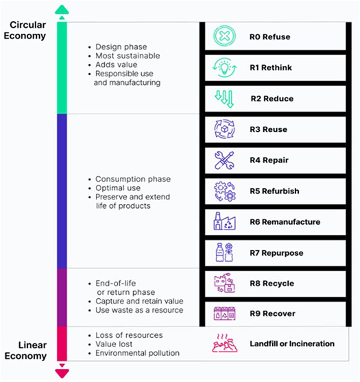 Many authors use a similar R0 to R9 (or 9R) strategic framework version and keywords with the “Rs” order of importance in order from refuse (R0), rethink (R1), reduce (R2), reuse (R3), repair (R4), refurbish (R5), remanufacture (R6), repurpose (R7), recycle (R8), to recover (R9) (Muñoz et al., 2024; Alivojvodic and Kokalj, 2024; Evolveable Consulting, 2024; Smol et al., 2024; Potting et al., 2017). This is shown hierarchically in Figure 1 with some explanations.