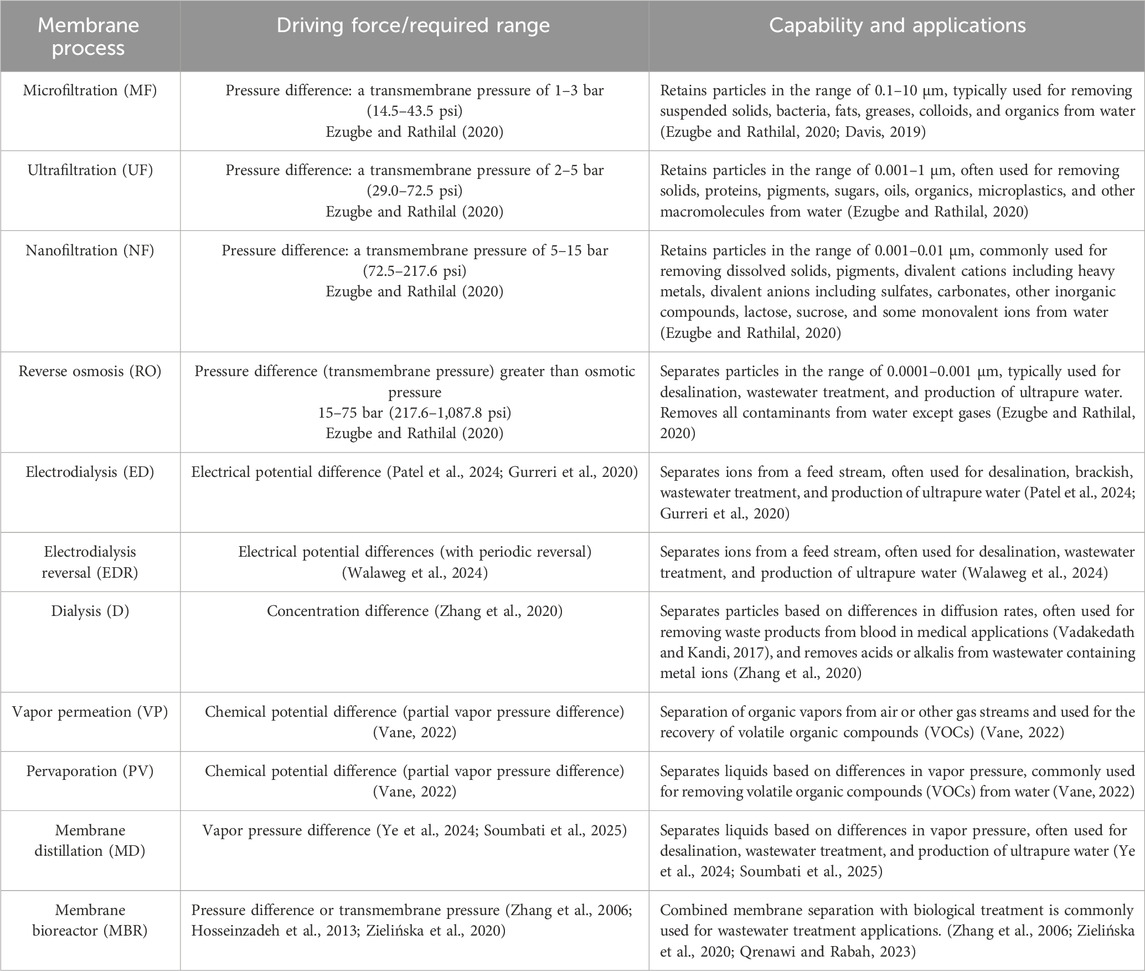 The choice of a membrane process depends on the specific separation requirements, feed stream characteristics, and driving force. Table 1 shows some membrane processes with their driving forces, capabilities, and applications. Pressure-driven membrane processes are of interest in this article.