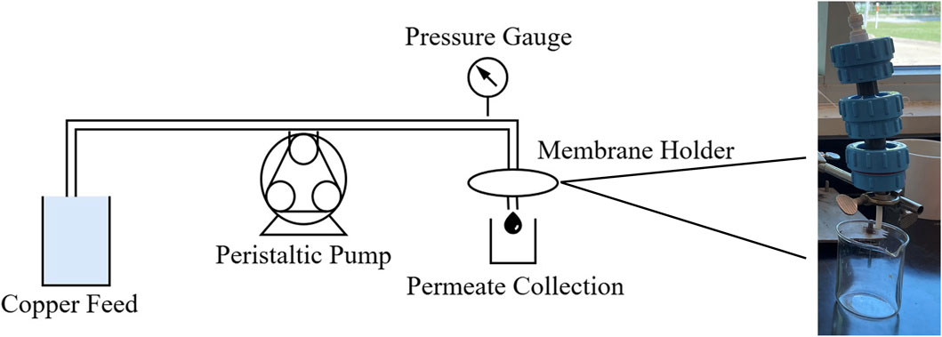 Solutions of different copper concentration were filtered using membranes grafted for 4 min at a flux of 135 Lm−2h−1. The membrane with 4 min grafting time was chosen based on the permeability results. Further the flux of 135 Lm−2 h−1 was chosen to be higher than or comparable to the operating flux of UF membranes while operating at a much lower pressure. UF membranes are often operated between 50 and 100 Lm−2 h−1 at pressures between 1 and 3 bar, compared to 135 Lm−2 h−1 at 0.07 bar in this work (Barakat and Schmidt, 2010). Samples were collected over time to create breakthrough curves used to determine the maximum dynamic binding capacity. Dynamic capacity was determined through integration of the obtained breakthrough curve. At least three membranes were tested for each concentration. After single membrane filtration, membranes in series experiments were conducted by stacking 3 membranes in series and repeating the analysis (see Figure 2).