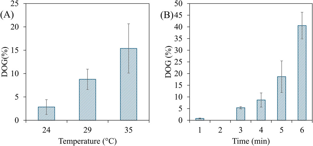 The effect of grafting temperature and time on DOG were determined. Figure 3A shows the change in DOG as a function of temperature at a constant grafting time of 5 min. The maximum temperature tested was 35 °C in order to ensure stability of the membrane. It was observed that increasing the temperature had a strong impact on the DOG. From these results, 35 °C was chosen as the constant grafting temperature for subsequent experiments. Next, UV grafting time was varied from 1 to 6 min, and the resulting DOG is presented in Figure 3B. As can be seen grafting times less than 3 min led to little grafting.