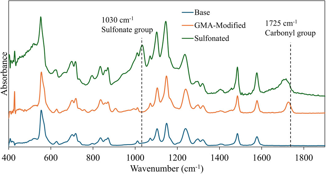 Based on these results, 1 min grafting time was not considered further as there was little change in DOG. IR spectra for the base membrane, after GMA grafting and sulfonic acid functionalization are shown in Figure 4 for a 4 min grafting time. A new peak at 1725 cm−1 characteristic of the C=O carbonyl group stretching appears after GMA grafting (Yu et al., 2020). After sulfonic acid functionalization a new peak appears at 1030 cm−1 characteristic of the sulfonic group (Fraser et al., 2022). Appearance of these new peaks confirmed successful membrane modification. Studies were also performed to examine the growth of these characteristic peaks with grafting time. Figure 5A shows the growth of the carbonyl peak characteristic of GMA with increasing grafting time. As can be seen a 2 min grafting time shows no carbonyl peak. Consequently sulfonation was not conducted for this membrane. Figure 5B shows the growth of the sulfonate peak with increasing GMA grafting time and hence increasing density of epoxide groups. Further, stability of the membranes in an acidic environment was confirmed after the reaction in sulfuric acid at 80 °C as no change in the spectrum was observed (Figure 4).