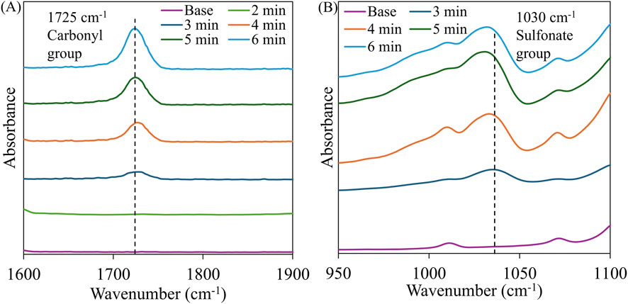 Figure 5. FTIR spectra for membranes with different grafting times. (A) shows the carbonyl group at 1725 cm−1 and (B) shows the sulfonate group at 1030 cm−1.