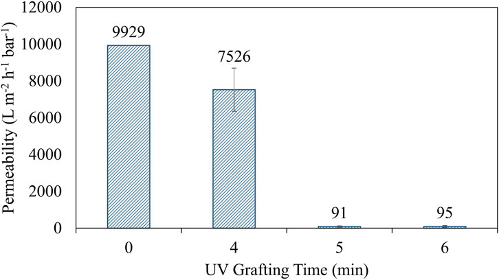 During surface modification grafting will occur not just on the outer membrane surface but also in the membrane pores (Car et al., 2018). Grafting in the membrane pores will lead to pore constriction and ultimately blocking which will reduce membrane permeability. DI water permeability was measured at a flow rate of 20 mL/min using a peristaltic pump. The resulting pressure and any drop in flow rate due to changes in the membrane permeability were recorded. Pressure was monitored using a pressure gauge and the flow rate was calculated by weighing the permeate collected over a certain amount of time. The membranes were mounted in holders from Advantec (Cole-Parmer, Court Vernon Hills, IL, United States) with an area of 17.35 cm2. Permeability was calculated using Equation 2. Where P is permeability, (L m-2 h−1 bar−1), V permeate volume (L), A membrane area (m2), t is time (h), and p is pressure (bar).