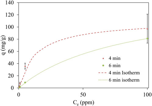 Maximum adsorption capacities and K (adsorption affinity) values for both membranes were calculated using Equations 5, 6. The values were 111 mg/g and 0.073 L/g, for 4-min grafting 149 mg/g and 0.012 L/g, for 6 min grafting for adsorption capacity and adsorption affinity, respectively. However even after 24 h incubation at a solution concentration of 100 ppm, the 4-min grafted membrane displays a higher amount of copper adsorbed per gram of grafted weight than the 6 min grafted membrane.