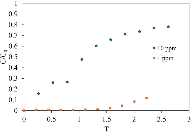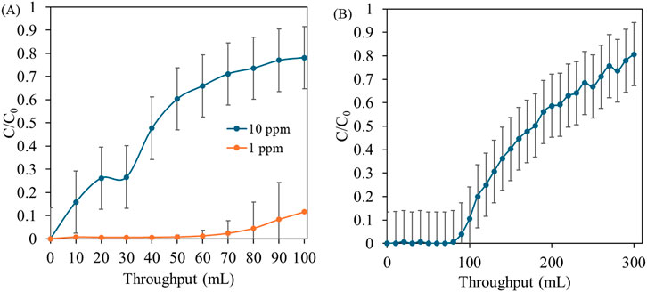 The dynamic capacity was defined as C/C0 = 0.7. Figure 9A gives the variation of C/C0 with throughput for a feed concentration of 1 and 10 ppm copper. For 10 ppm copper in the feed, C/C0 reached 0.7 for a throughput of 70 mL. However for 1 ppm copper in the feed, the dynamic binding capacity was not reached. The dynamic binding capacity was calculated to be 64.5 ± 0.6 mg/g. The feed pressure was <0.07 bar confirming low pressure operation. The error bars represent the range of values for duplicate experiments.
