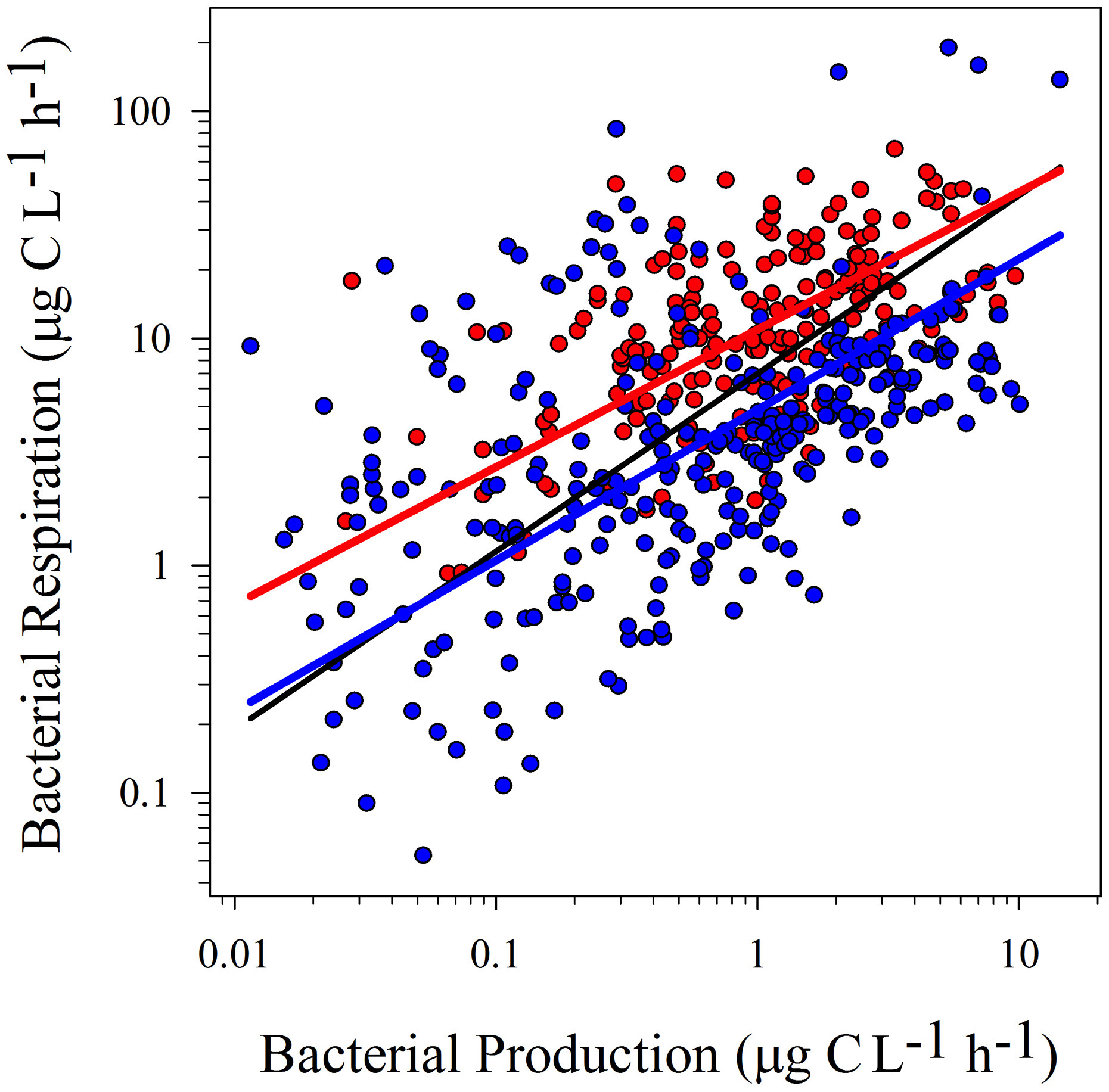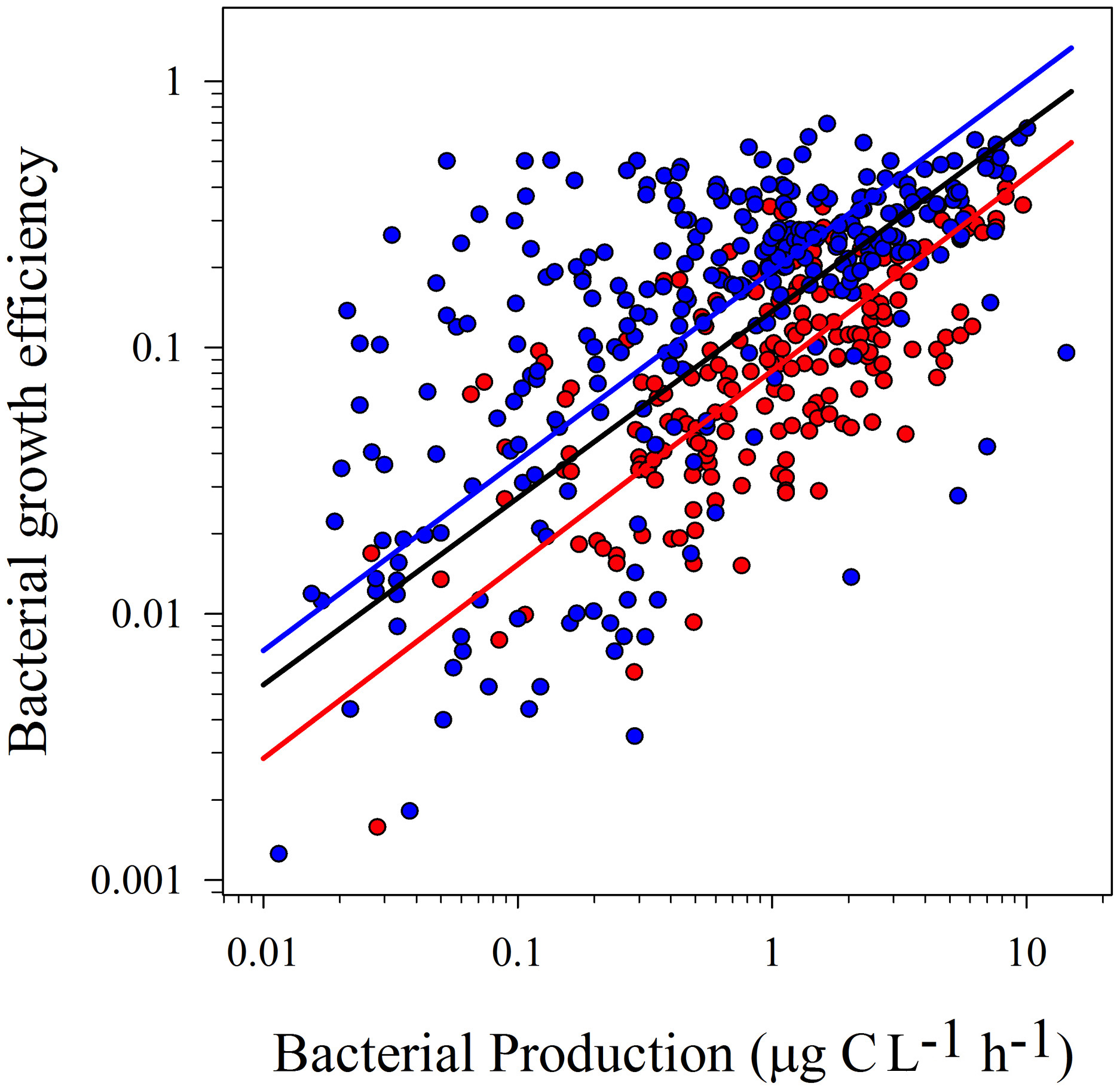 Model II linear regressions on log-transformed BP and BR were significant, either considering the whole dataset or data from tropical and temperate regions separately (Table 2; Figure 1). Similarly, there was a significant positive relationship between log-transformed BP and BGE (Table 2; Figure 2).