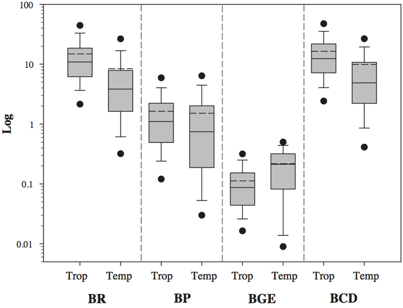 Comparison of logBP, logBR, logBGE, and logBCD among temperate (Temp) and tropical (Trop) freshwater systems. The central full line indicates the median value, the dotted line indicates the arithmetic mean value, the boxes indicate the lower and upper quartiles, the vertical lines indicate the 10th and 90th percentiles, and the dots represent the 5th and 95th percentiles. Tropical and temperate data were significantly different (non-parametric Mann–Whitney Rank Sum test) in all the four variables (BP, BR, BGE and BCD with p < 0.001, see text for details).