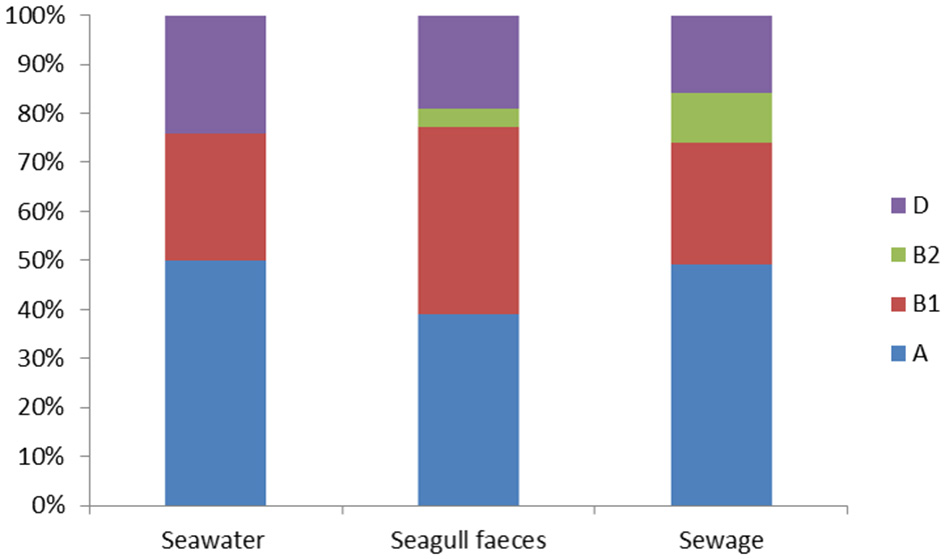 Distribution of the E. coli phylogenetic groups (A, B1, B2 and D) among seawater (n = 166), seagull feces (n = 179) and human-derived sewage (n = 69).