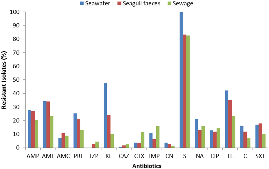 For the majority of the antibiotics tested (e.g., penicillins, cephalothin, tetracycline), resistance rates were higher in isolates from seawater and seagull feces (Figure 2). Resistance to imipenem, 3rd generation cephalosporins and ciprofloxacin was most common in sewage. Multi-resistance levels (i.e., resistance to antibiotics of at least three different classes) were higher among isolates recovered from seawater (39%), followed by isolates from seagull feces (32%) and sewage (29%).