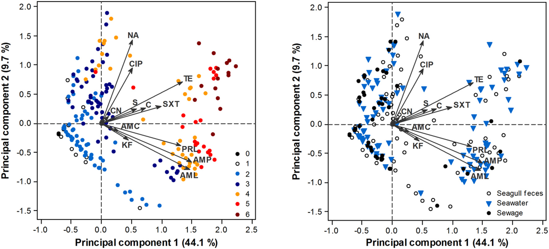 PCA biplot of E. coli isolate scores in terms of their AR profile. Arrows represent antibiotics: AMP, ampicillin; AML, amoxicillin; AMC, amoxicillin/clavulanic acid; PRL, piperacillin; TZP, piperacillin/tazobactam; KF, cephalothin; CAZ, ceftazidime; CTX, cefotaxime; IMP, imipenem; CN, gentamicin; S, streptomycin; NA, nalidixic acid; CIP, ciprofloxacin; TE, tetracycline; C, chloramphenicol; SXT, sulfamethoxazole/trimethoprim. TZP, CAZ, CTX, IMP have little influence in the ordination, thus respective arrows are not perceptible. Scores are depicted according to the number of antibiotic classes that isolates are resistant to (0–6; left panel) or source of origin (right panel).