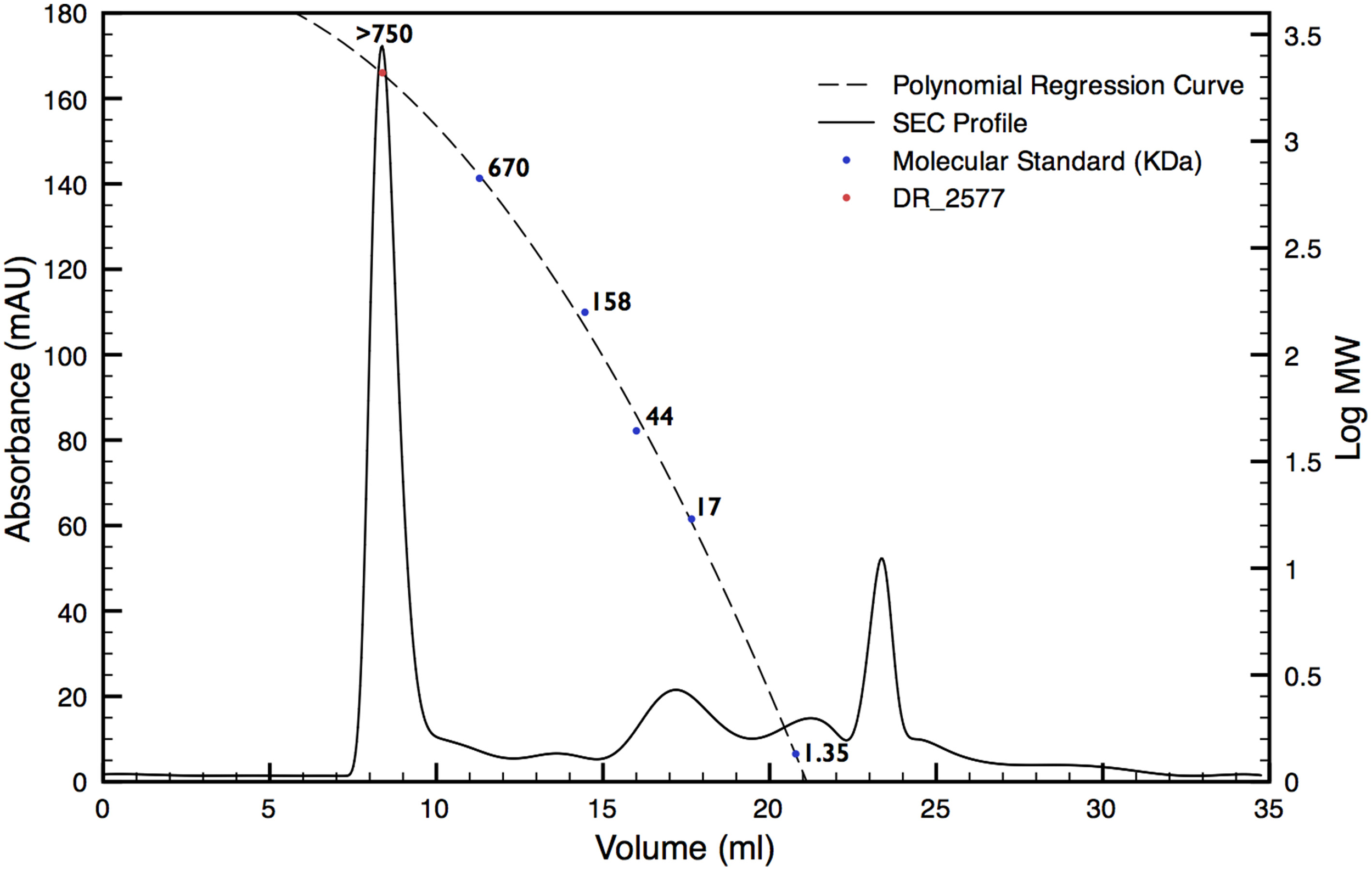SEC profile for DR_2577 enriched samples (dashed line). The elution profile shows a main peak eluted at small retention volumes suggesting the presence of a high molecular weight complex. A polynomial regression curve is shown (dotted line) calculated on the basis of the retention volumes of the molecular standard (blue dots). The red dot on the polynomial regression curve shows the calculated mass for DR_2577.