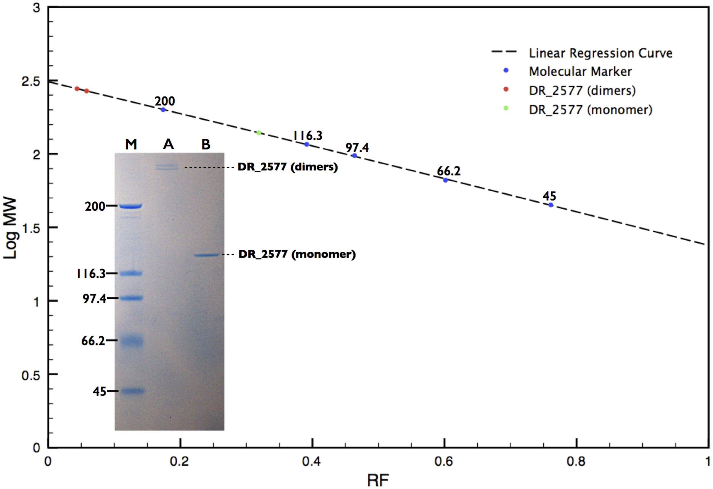 SDS-PAGE analysis of the DR_2577 sample eluted from the main SEC peak. A linear regression curve (dotted line) calculated on the base of the retardation factors of the molecular standard (blue dots) is shown. The two red dots and the green dot on the polynomial regression curve show the calculated mass found for the DR_2577 dimers and monomers, respectively. The insert shows that standard procedures of sample denaturation lead to the separation of two near bands above 200 kDa (A); samples treated under harsher conditions (see text) bring to a single band of 120 kDa (B); the lane M indicates the standard with the corresponding molecular weights.