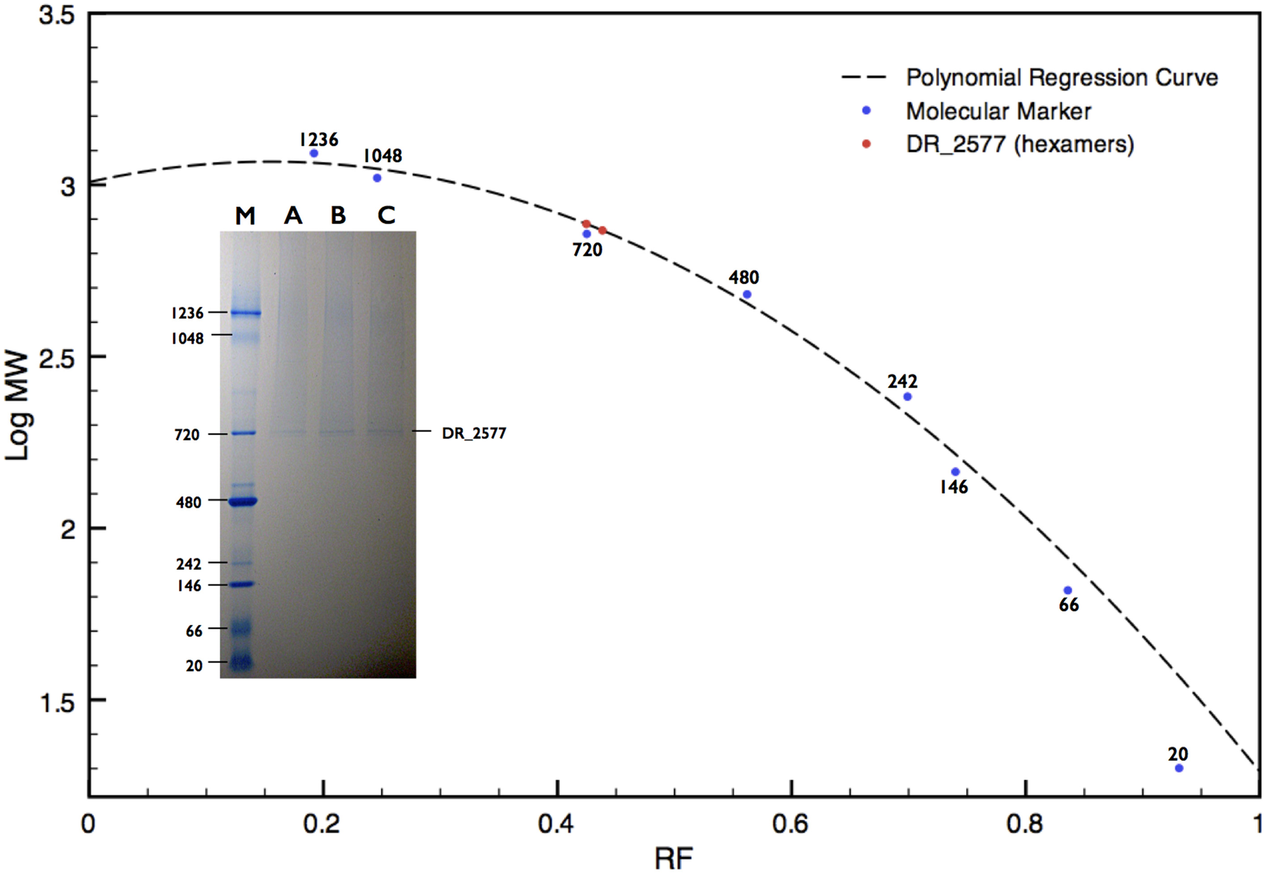 BN-PAGE analysis of the DR_2577 sample eluted from the main SEC peak. A polynomial regression curve is shown (dotted line) calculated on the base of the retardation factors of the molecular standard (blue dots). The two red dots on the polynomial regression curve show the calculated mass found for the DR_2577 complexes. The insert shows a typical DR_2577 sample (A, B, and C) separated by SEC and resolved by BN-PAGE; the lane M indicates the standard with the corresponding molecular weights.
