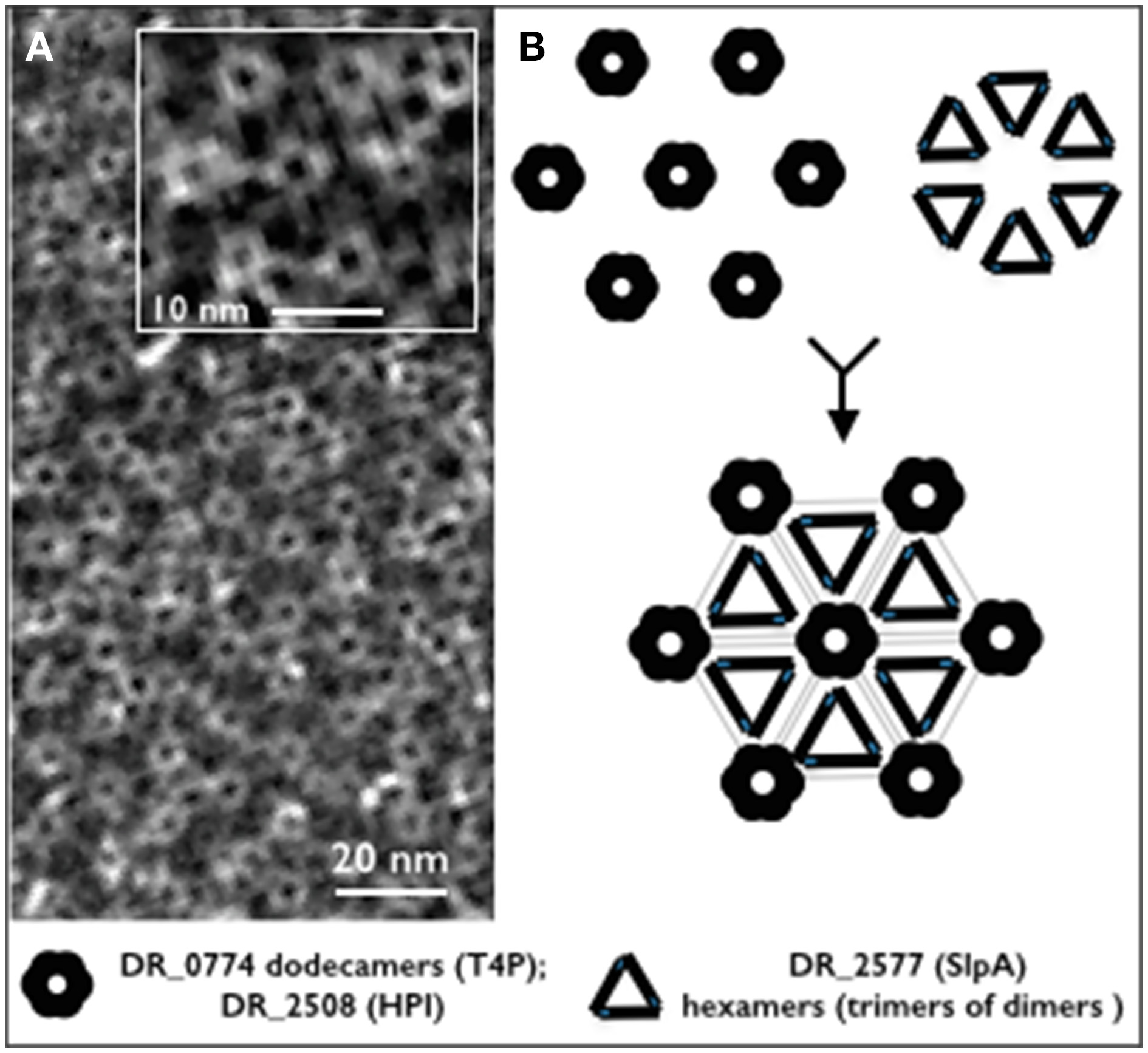 (A) Micrograph of a cell wall fragment showing the regular S-layer organization (from Farci et al., 2014). The inbox shows a magnified detail of the characteristic hexameric repetition for this S-layer; (B) schematic reconstruction of the hexameric unit on the base of the identified oligomeric profile showing a model with the possible localization of DR_2577 and DR_0774. The black and gray repetitions show trimers of DR_2577 dimers (hexamers), three hexamers are connected each other forming a closed structure which in its center host the DR_0774 channel and its related pore of HPI (DR_2508).