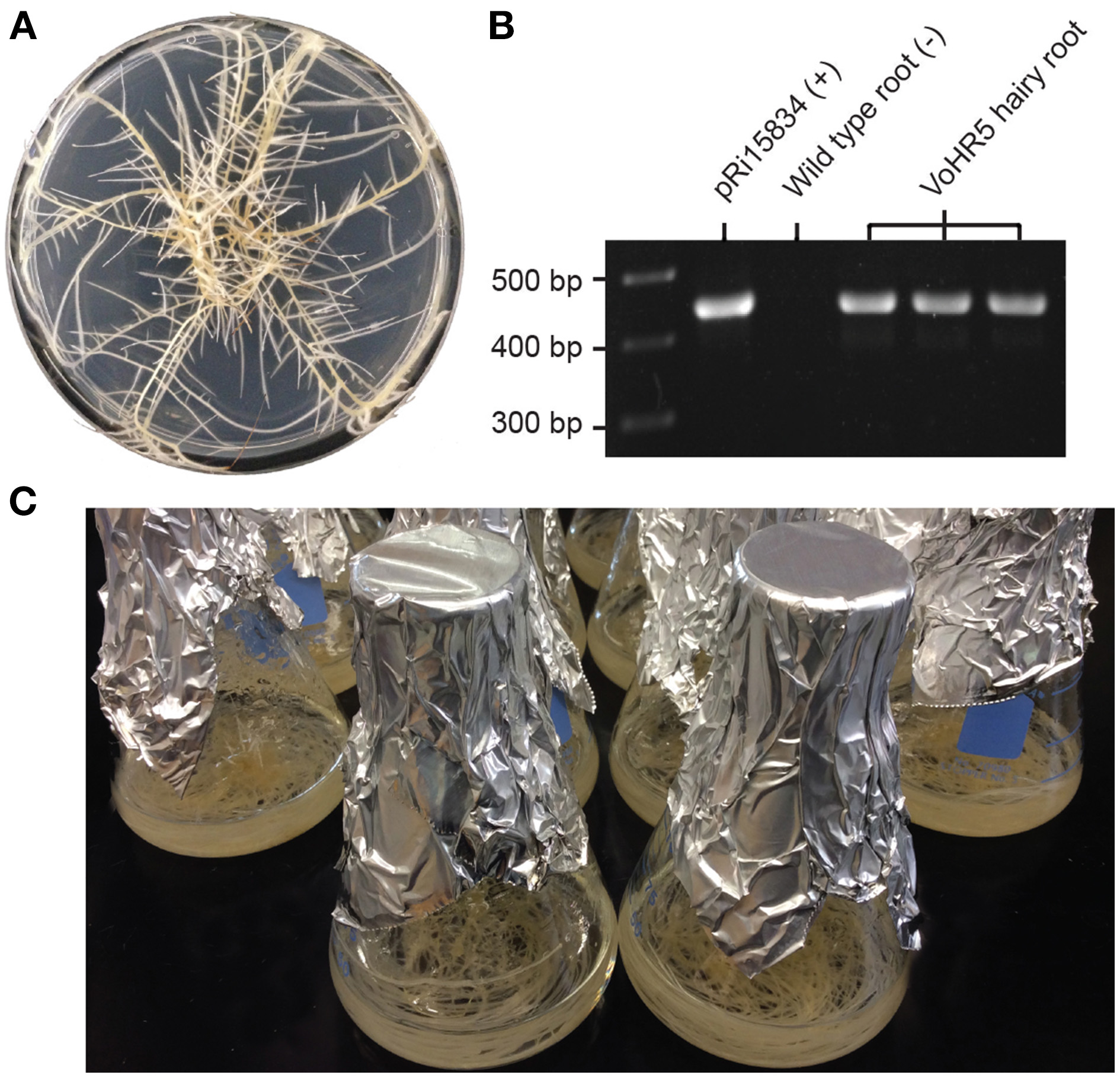 Establishment and growth of V. officinalis hairy roots transformed with A . rhizogenesharboring root-inducing plasmid pRi15384. (A) Growth characteristics of the hairy root clone VoHR5 on semi-solid media. This clone featured vigorous growth and significant lateral branching that is typical of the hairy root disease phenotype. (B) PCR characterization of V. officinalis hairy root line VoHR5 for stable integration of A. rhizogenes root-inducing plasmid DNA. VoHR5 genomic DNA was isolated from three independent subcultures and used as template for amplification of the rolB gene. Plasmid pRi15834 was used as a positive control. Genomic DNA isolated from wild type plant root was used as a negative control. (C) Mature cultures of the VoHR5 line grown in shake-flasks before harvesting at 28 days.