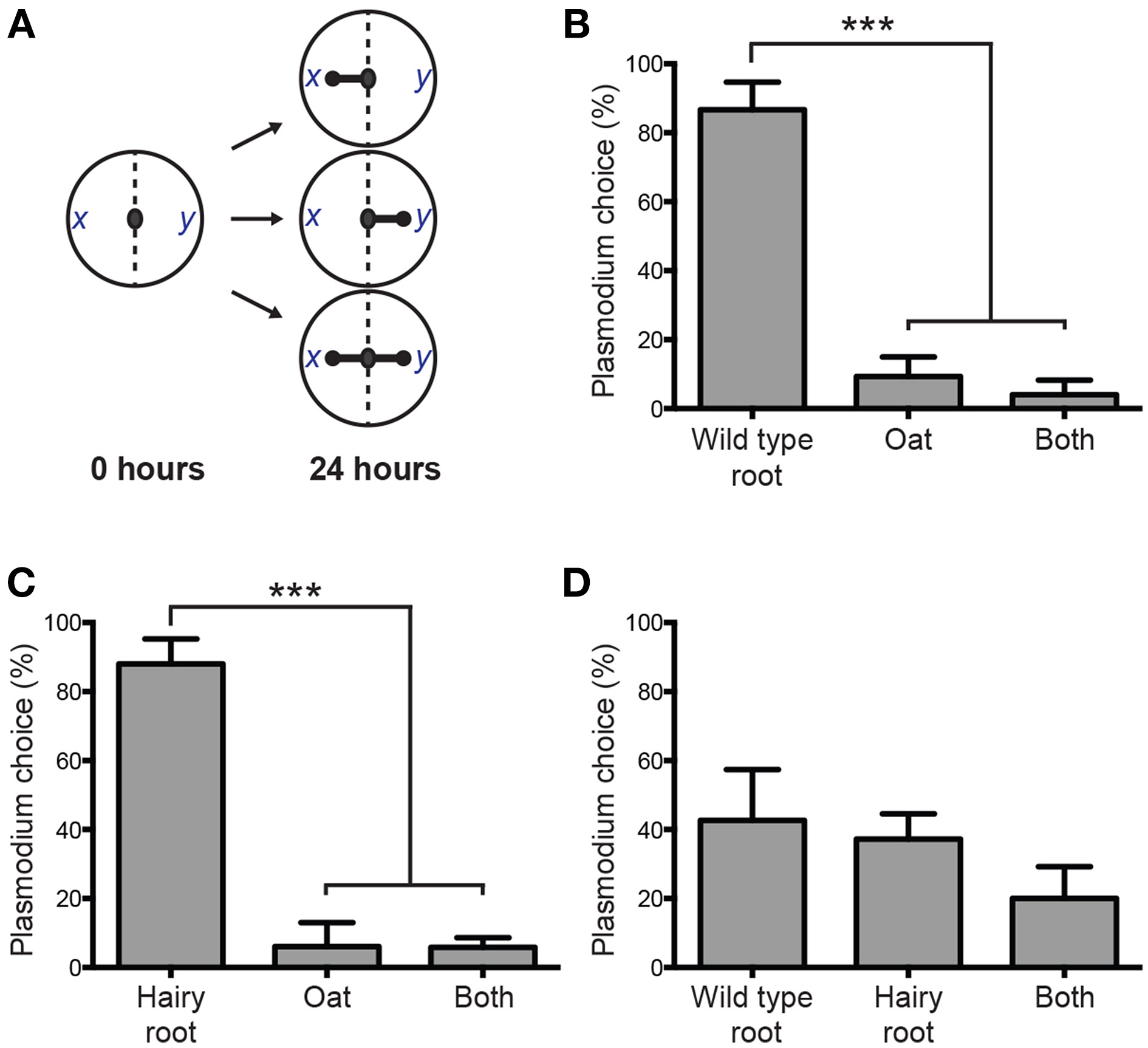 Selected results of plasmodium binary choice experiments. (A) Plasmodia inoculated onto assay plates containing oat flake in both sample locations extended concentrically onto the agar substrate, ultimately establishing a leading front toward one or both oat flakes. (B) Exemplary result of binary choice experiments between wild type V. officinalis plant root and oat. (C) Exemplary result of binary choice experiments between V. officinalis VoHR5 hairy root and oat. (D) Exemplary result of an equal preference event. Plasmodium chose both wild type plant root (left) and hairy root (right) simultaneously.