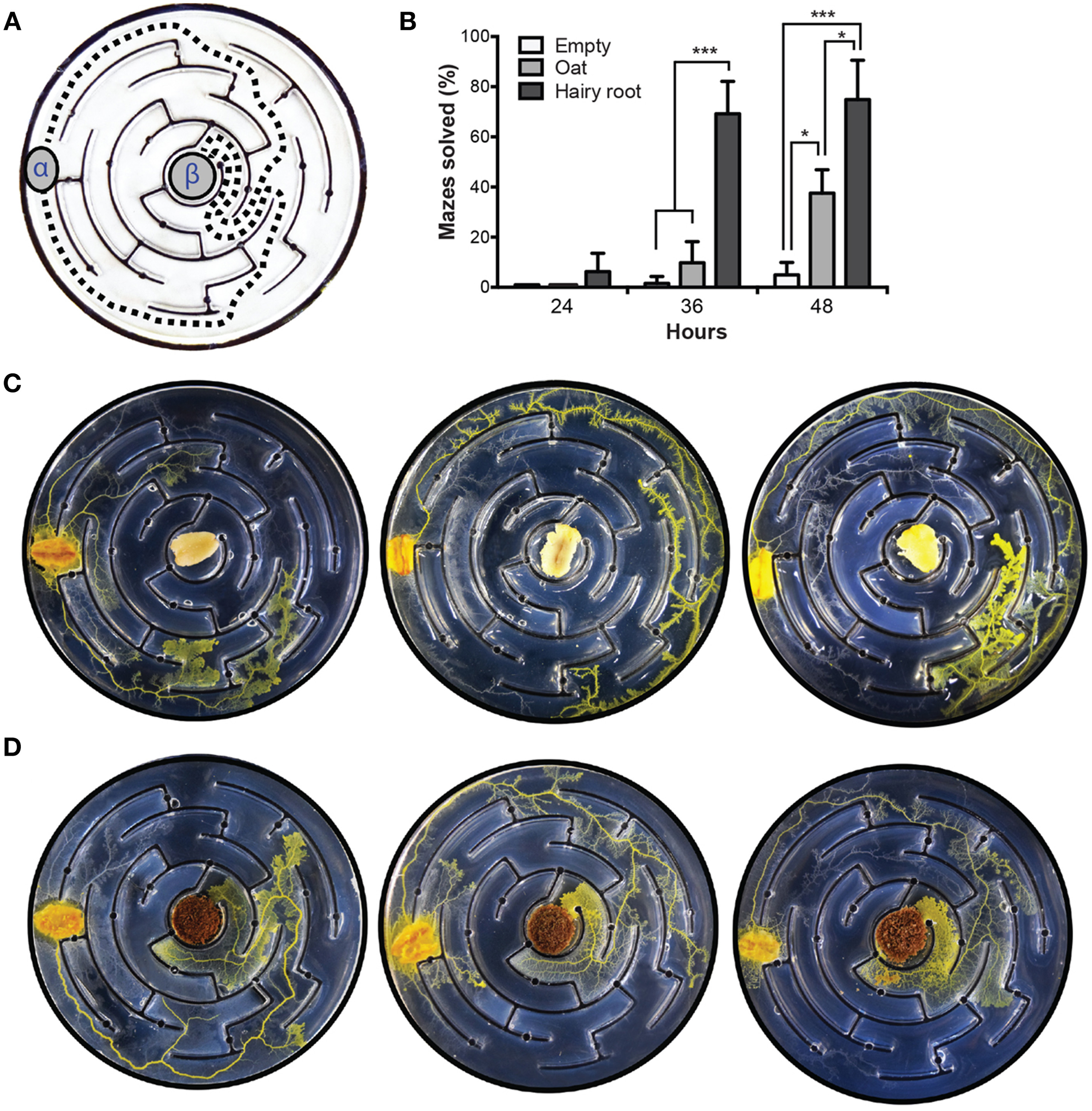 P. polycephalum maze-solving behavioral assay. Plasmodia were inoculated into the most peripheral channel of mazes containing either oat or VoHR5 hairy root in the central chamber. Mazes with empty central chambers were used as a control and completion was scored according to the arrival at the central chamber. (A) Schematic representation of the two optimal shortest paths to maze completion. α, site of plasmodium inoculation, β, central chamber. (B) Hairy root biomass augments the maze-solving behavior of P. polycephalum. After 36 h, plasmodia inoculated into control and oat-containing assays completed 1.5 and 10% of the respective mazes whereas plasmodia inoculated into assays containing hairy root achieved 69% maze completion. After 48 h, plasmodia completed 5% of control and 38% of oat-containing mazes whereas 75% of hairy root mazes were completed by this time. Data represent the means ± SD of three independent experiments containing at least twenty replicates each (*p≤0.05, ***P≤0.001, One-Way ANOVA with Tukey's post-test with a 95% confidence interval. Detailed statistical information is provided in Table S2). (C) Exemplary results of maze-solving behavior in assay plates containing oat in the central chamber after 36 h. Plasmodia explored all possible paths with no apparent directionality. In some experiments, plasmodia established a leading front upon detection of oat diffusion into the agar but did not complete the maze at the time of sampling (D) Exemplary results of maze-solving behavior in assay plates containing hairy root in the central chamber after 36 h. Plasmodia were routed via the two optimal shortest paths to the central chamber end point.