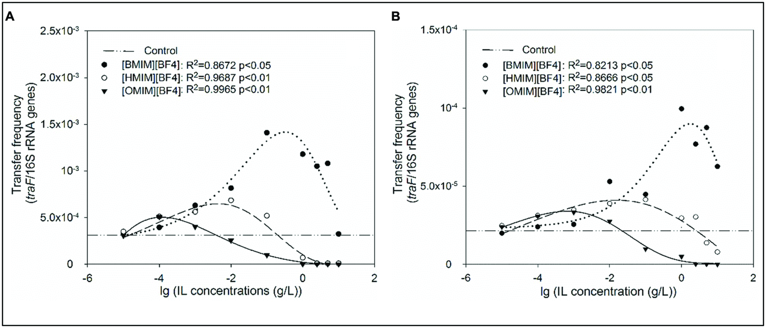 [CnMIM][BF4] (n = 4, 6, 8) promoted the plasmid RP4 transfer with dose-effect in freshwater microcosms and LB medium (Figure 2). The plasmid RP4 transfer frequency enhanced with increasing [CnMIM][BF4] concentrations, however, decreased when concentration is higher than 1.0 g/L for [BMIM][BF4], 0.01 g/L for [HMIM][BF4], and 0.0001 g/L for [OMIM][BF4]. Meanwhile, the dose-effect dependent of ILs [CnMIM][BF4] facilitating plasmid RP4 transfer associated with ILs’ effects on bacterial growth. In this study, the significant dose-effect inhibition was observed between the bacteria concentrations (the optical densities of OD600) and the concentrations of each of the compound ([CnMIM][BF4]; Figure 3 and Supplementary Figure S2B).