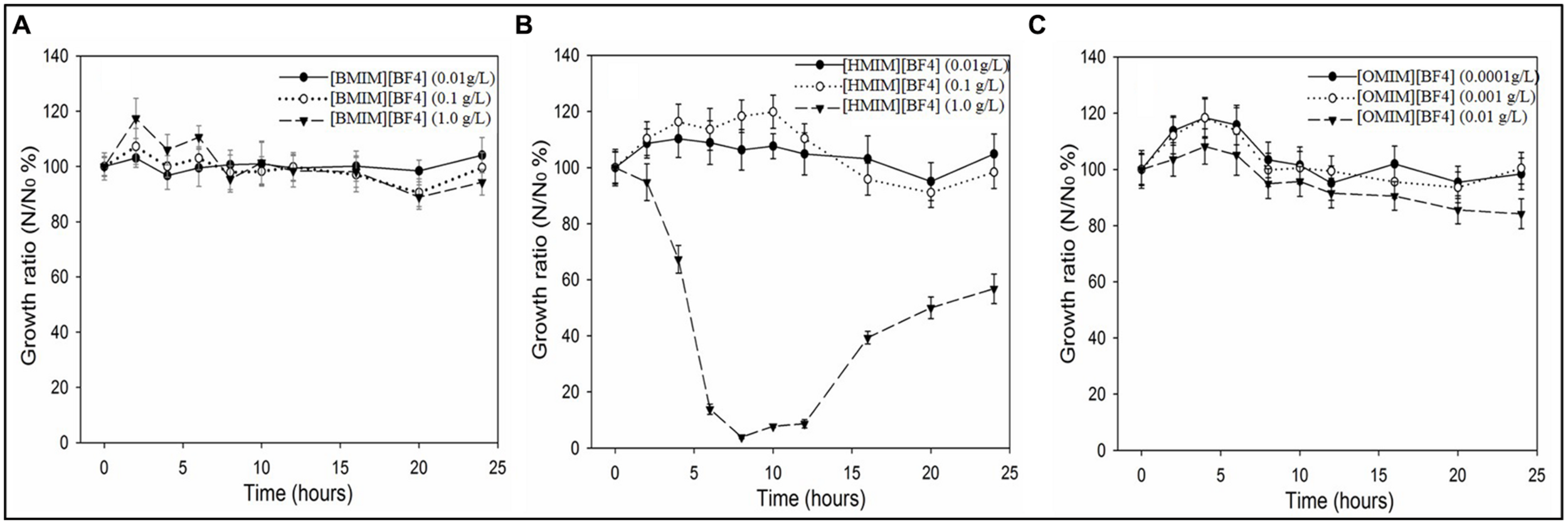 Growth ratio (N/No, %) of Escherichia coli DH5α in LB system treated with [CnMIM][BF4]. (A) [BMIM][BF4] (concentration of 0.01, 0.1, 1.0 g/L); (B) [HMIM][BF4] (concentration of 0.01, 0.1, 1.0 g/L); (C) [OMIM][BF4] (concentration of 0.0001, 0.001, 0.01g/L). Control: untreated with [CnMIM][BF4]. ([BMIM][BF4], n = 4; [HMIM][BF4], n = 6; [OMIM][BF4], n = 8).