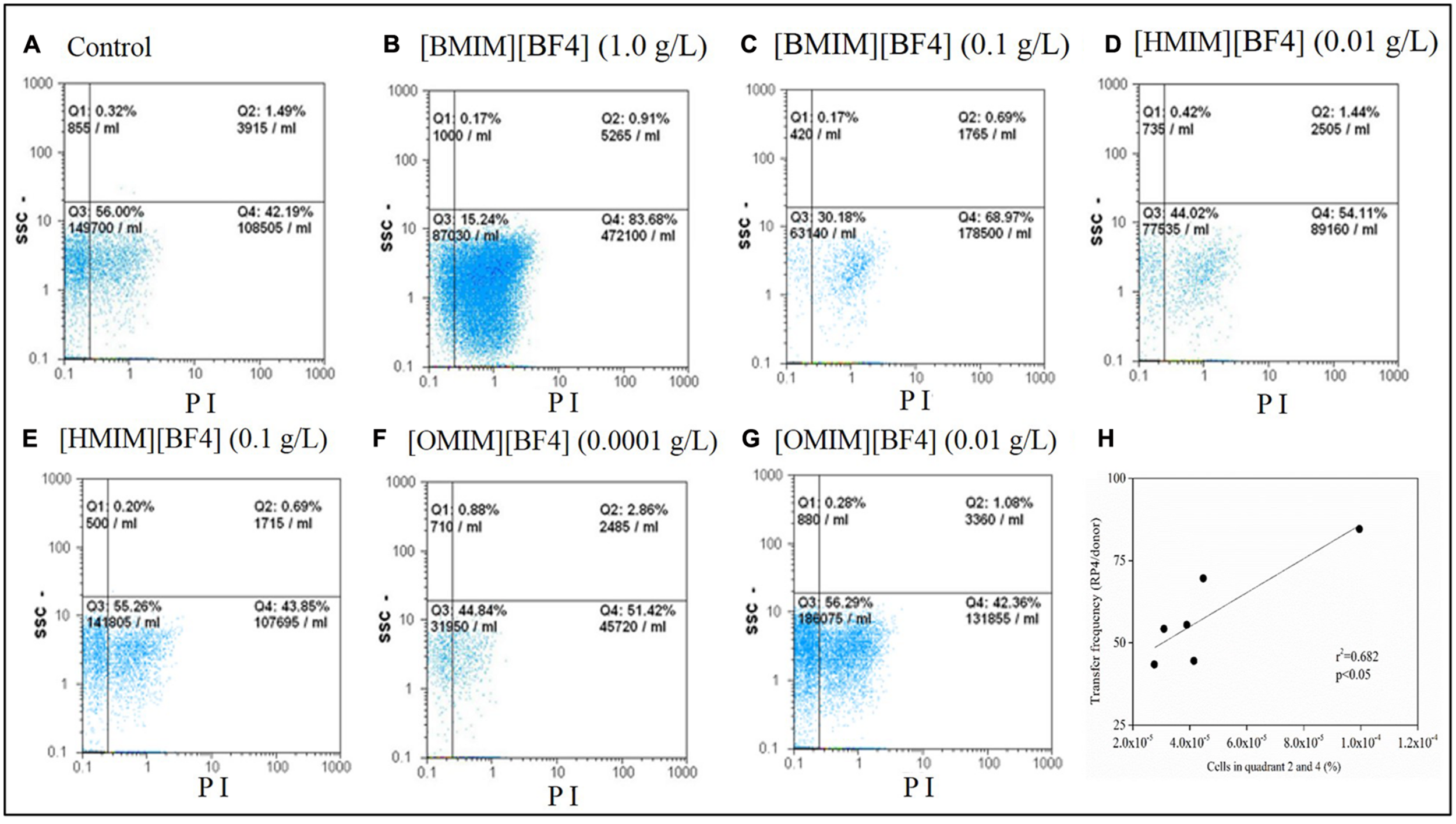 Cell membrane permeability of microorganisms in LB system treated with [CnMIM][BF4] under the concentration that the highest plasmid RP4 transfer frequency quantified using flow cytometry. Flow cytometry data in dot plot: Quadrant 1 and 3: negative signal (normal cells); Quadrant 2 and 4: PI positive (cells with increased cell membrane permeability). (A) Control: untreated with [CnMIM][BF4]. (B,C): [BMIM][BF4]; (D,E): [HMIM][BF4]; (F,G): [OMIM][BF4]. (H) Correlation between transfer frequency in LB system with percentage of cells with increased cell membrane permeability (PI positive) in the total cells treated with [CnMIM][BF4]. ([BMIM][BF4], n = 4; [HMIM][BF4], n = 6; [OMIM][BF4], n = 8.)