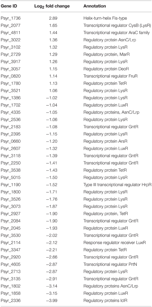 Forty TFs differentially changed their expression after 3 h treatment period; 11 of them were up-regulated (Table 2 and Supplementary Table 1). Notably, among up-regulated TFs were MarR and LysR proteins. MarR TFs, multiple antibiotic resistance regulators and members of the winged helix-turn-helix TF family, regulate activity of genes involved in responses to many environmental factors, including oxidative stress and degradation of phenolic compounds (Grove, 2013). LysR TFs are the most abundant transcriptional regulators in bacteria that govern a diverse set of genes, including those involved in virulence, metabolism, quorum sensing, and motility (Maddocks and Oyston, 2008). One of the induced TFs (ID Psyr_3022) is a member of the Lrp/AsnC (leucine-responsive regulatory protein/asparagine synthase C products) family of transcriptional regulators, widespread in bacteria. Activated TF Psyr_4811 is from the AraC family of transcriptional regulators that have three main regulatory functions: carbon metabolism, stress response and pathogenesis (Gallegos et al., 1997). Up-regulated LysR-type TF CysB controls the biosynthesis of cysteine and sulfur utilization in E. coli. (Jovanovic et al., 2003). In Pseudomonas aeruginosa, CysB was shown to regulate transcription of the alternative sigma factor PvdS that controls response to iron starvation, virulence, and biogenesis of the pyoverdine siderophores and synthesis of extracellular factors (Imperi et al., 2010). Helix-turn-helix FIS-type TF (Psyr_1736) was up-regulated although qPCR analysis did not confirm RNA-seq data on this gene. Up-regulation of FIS-type TF might suggest ribosomal activity such as transcription of ribosomal RNA and activation of rRNA promoters (Bartlett et al., 2000).