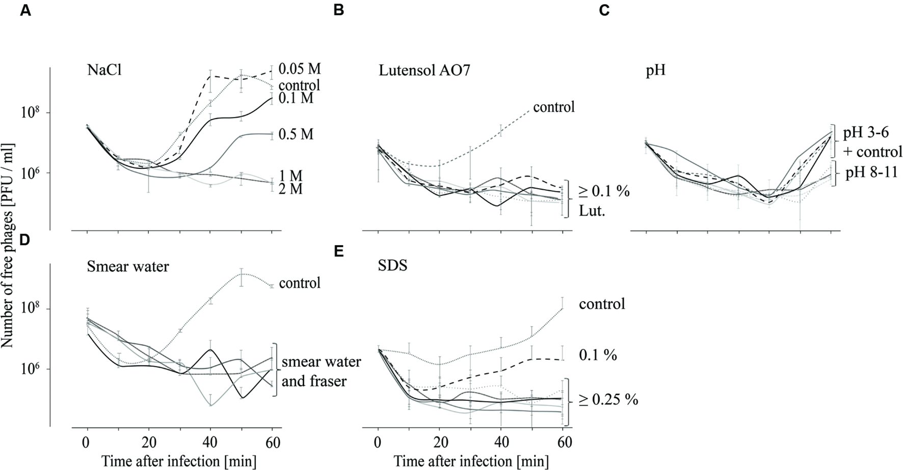 To analyze the influence of different chemical conditions on the efficacy of phage treatments, L. monocytogenes EGDe was infected with phage P100 and grown in Fraser Listeria Selective Enrichment Broth base (Merck, Darmstadt, Germany), TSB and TSB medium with different salt concentrations, detergent (Lutensol AO 7 and SDS) concentrations and in TSB adjusted to different pH values (see Influence of Environmental Factors on the Infectivity of P100). Additionally, the efficacy of phage treatment in smear water, obtained from an Austrian dairy plant, was investigated. The influence of these factors on the growth of uninfected L. monocytogenes EGDe was monitored as a control.