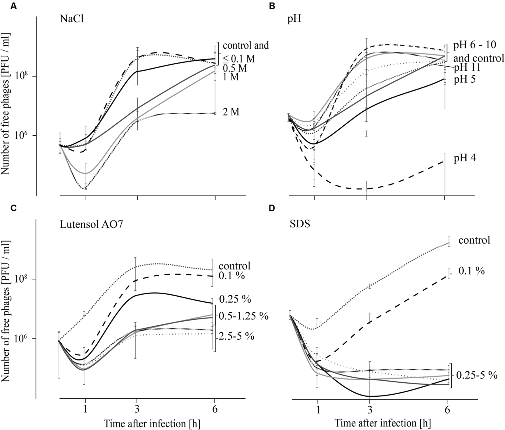 In following the sequence of events during the reproductive infection cycle of P100 we examined the influence of pH, salt concentration and the presence of two detergents as representative of chemical factors present in the production environment. The respective experiments were conducted short-term (up to 24 h). Moreover, long-term experiments were conducted for 120 days.
