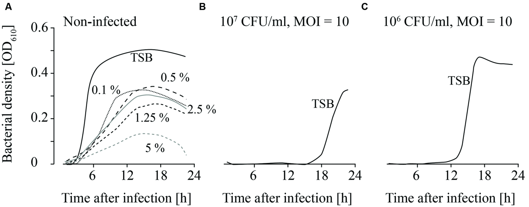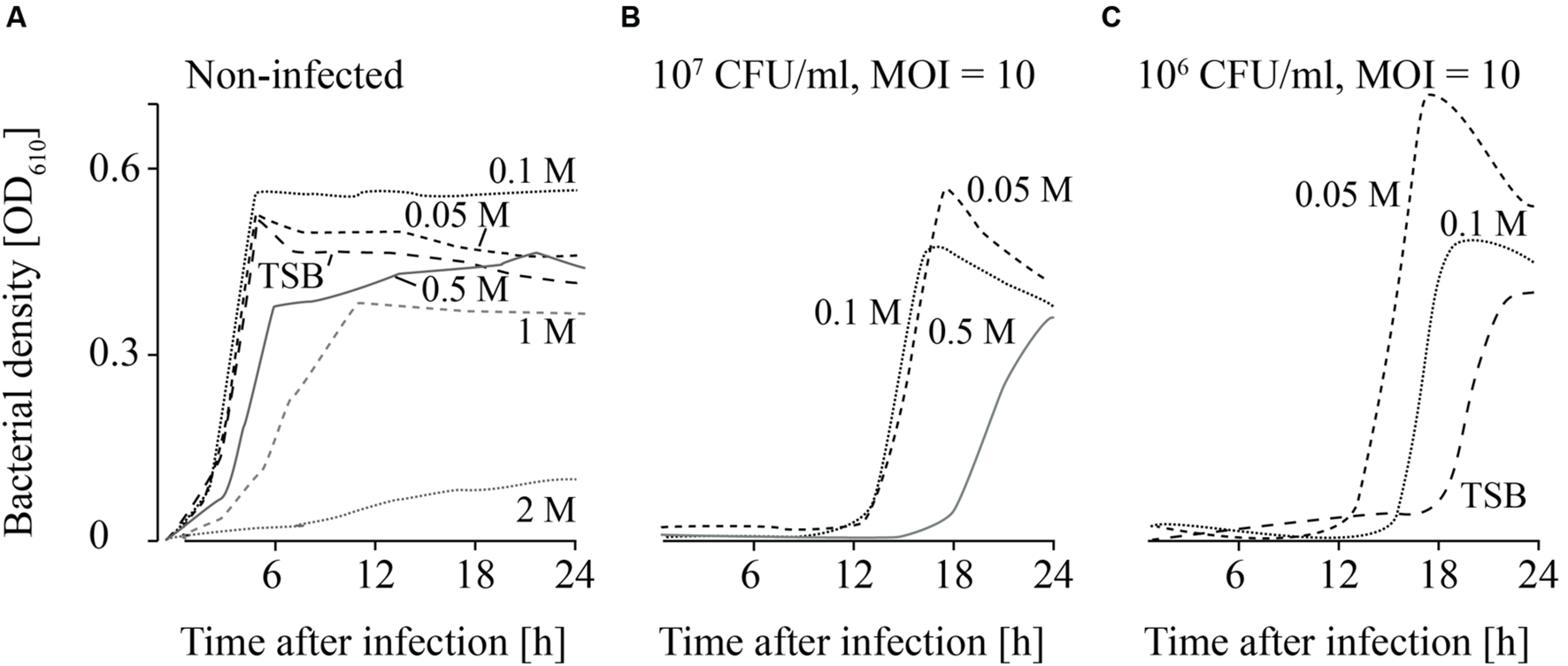 Growth curves of uninfected (A) and infected (B,C; MOI = 10) L. monocytogenes in TSB and NaCl containing TSB media. Bacteria concentrations at the beginning of the infections were 107 CFU/ml (A,B) and 106 CFU/ml (C). All NaCl concentrations (0–2 M) were tested. For the sake of clarity only the curves of growing bacteria were demonstrated while the others on base line level were not depicted. Moreover, one of four independent experiments is representatively shown.