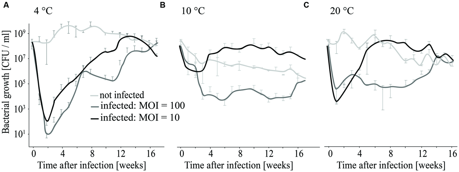 Long-term infection experiment using different MOIs and temperatures for incubation. Growth of infected and non-infected L. monocytogenes was monitored at 4°C (A), 10°C (B), and 20°C (C).