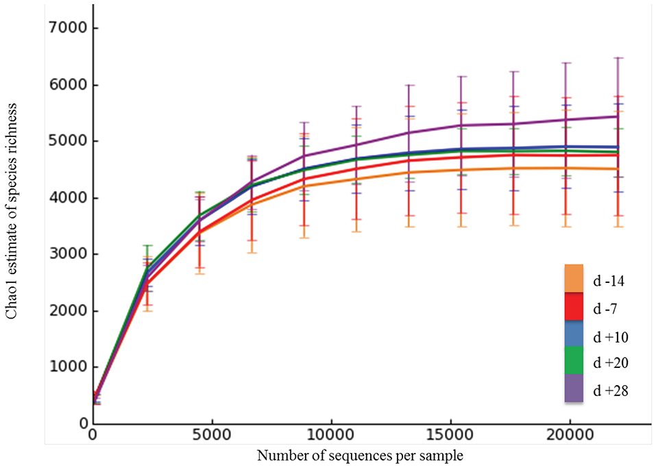 Rarefaction analysis for the observed species. The rarefaction curve was generated using Chao1 richness estimator. Samples were rarified at an even depth of 22,000 sequences per sample. Color codes denote samples collected at different days relative to calving. Error bars denote the 95% confidence intervals.