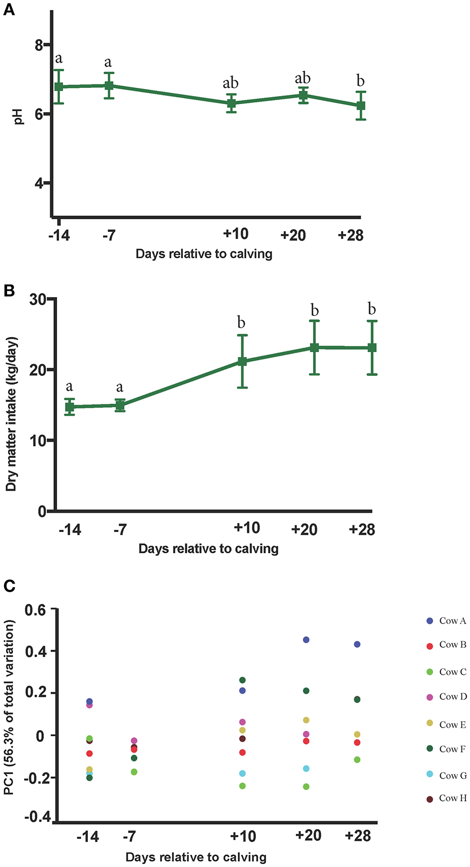 Although the endocrine, metabolic, physiologic, and molecular adaptations occurring in dairy cows around the peripartal period are reasonably well-described (Loor et al., 2013), there are few published studies (Lima et al., 2015; Pitta et al., 2014a; Indugu et al., 2016) that have evaluated the shifts in the ruminal microbiota composition during this period. More importantly, there is a knowledge gap on the changes occurring in the functional properties of the ruminal microbiota during the transition into lactation and their correlation with phenotypic measures of animal performance traits, such as milk production and composition. Thus, the main objectives of this study were to (a) characterize changes in the ruminal microbiota composition during the peripartal period, (b) predict shifts in the functional properties of the ruminal microbiome during this period, and (c) correlate such changes with dry matter intake (DMI), milk production, and milk composition.