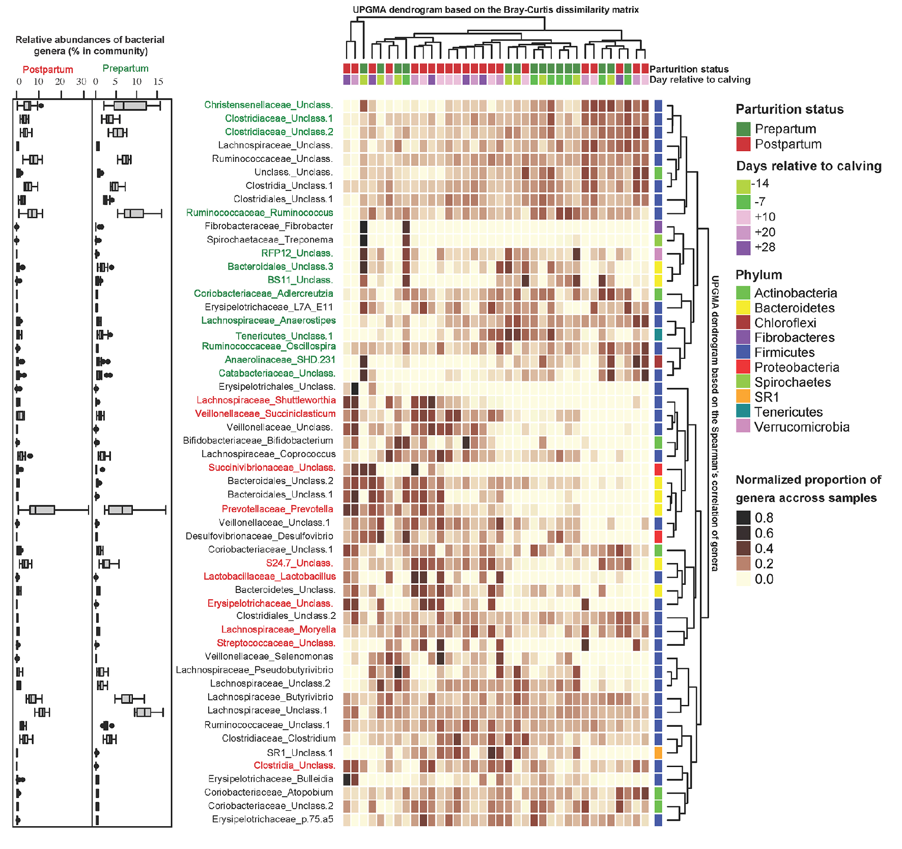 Taxonomic classification of clustered OTUs revealed the presence of 16 bacterial phyla (Table 3). While the majority of OTUs were identified at the genus (g.) or species levels, some were only classified at the phylum (p.), class (c.), order (o.), or family (f.) level. Abundant phyla (above 1% of community) included Firmicutes, Bacteroidetes and Tenericutes, whereas Actinobacteria, Cloroflexi, Proteobacteria, SR1, Verrucomicrobia were in medium-abundance (between 0.1 and 1% of community) and Armatimonadetes, Cyanobacteria, Fibrobacteres, Planctomycetes, Spirochaetes, Synergistetes, TM7 and WPS-2 were in low abundance (below 0.1% of community). The proportions of Tenericutes, Cloroflexi, and Verrucomicrobia phyla were higher during the prepartum (P < 0.05), and Actinobacteria during the postpartum.