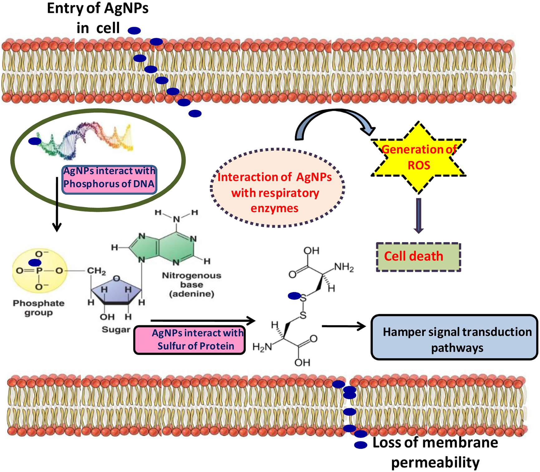Beside the simple shape or structure of bacteria, they possess a well developed structure of cell that performs many biological functions. Intracellular distribution of any solute or AgNP depends on their surface area to volume ratio (Pal et al., 2007). Studies have demonstrated that some small granular (electron dense) structures either accumulate in the cells or adhere near the cell wall (Feng et al., 2000). Furthermore, Feng et al. (2000) also demonstrated that accumulation of the sulfur, silver ions and dense electron granules occurs in the cytoplasm. This process disrupts the bacterial membrane and makes the entrance of AgNPs in the cell easy. Moreover, it also leads to the alteration in integrity of cell by continuous leakage of intracellular potassium from the cell (Navarro et al., 2008). The probable mechanism for the target and interaction of silver species might also be the thiol groups found in proteins (Lok et al., 2006). Similarly, another site for interaction of silver species to the bacterial cell could be phospholipid membrane (Lok et al., 2006). In the same way, fungal cells comprise of cell wall which inhibit the transition from AgNP in cells. Fungi cell wall consists of some significant constituents like carbohydrates which form a stiff and elusive structure (Navarro et al., 2008). The main component of fungal cell is their chitinous cell wall that is semipermeable in nature and acts as a sieve to allow the transition of small particles while inhibiting the larger ones. However, sometimes the pore size increases during reproduction period due to the effect of AgNPs and recently formed pores permit the translocation of the larger AgNPs (Ovećka et al., 2005; Navarro et al., 2008). Due to substantial alteration during exposure of AgNPs, “pits” are formed on the cell wall surface leading into the creation of pores and result in the destruction of cell metabolism (Navarro et al., 2008). The membrane barriers may collapse due to AgNPs by outflow of ions and other materials which alters the electrical potential of the membrane.