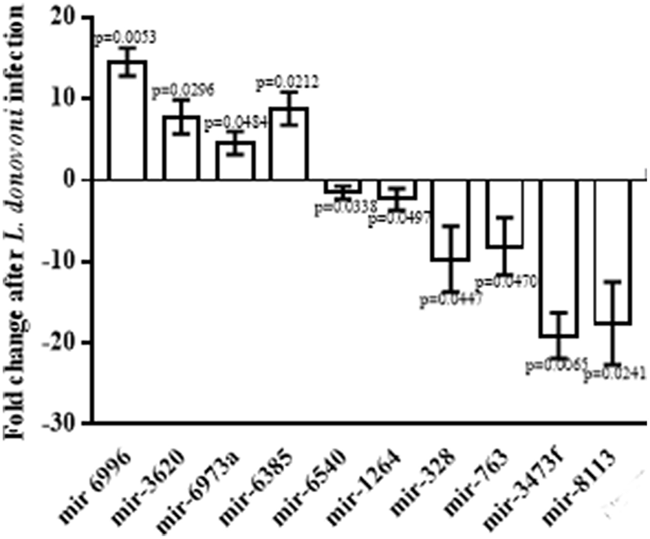 Relative expression of miRNAs in infected macrophages. Macrophages were infected with L. donovani in a ratio of 1:10 (macrophage: parasite) for 6 h, and then thoroughly washed to remove non-ingested parasites. Macrophages were further incubated at 37°C for 24 h and total RNA was isolated from lysed cells. The miRNAs, mir-6996, mir-3620, mir-6973a, and mir-6385 were found significantly up regulated whereas mir-6540, mir-1264, mir-328, mir-763, mir-3473f, and mir-8113 were found significantly down regulated.