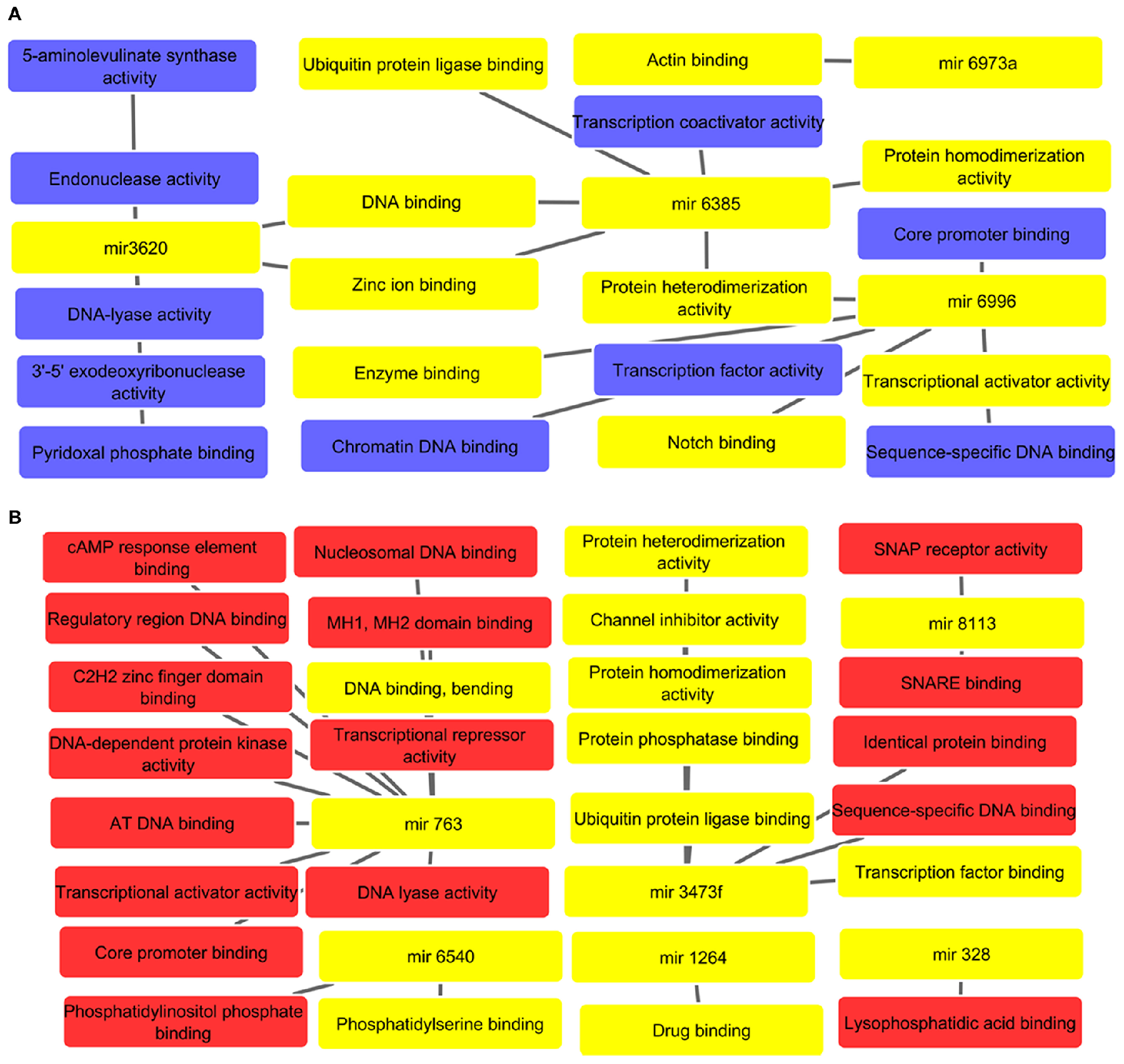 (A) Molecular network of up regulated miRNAs. All interlinked miRNAs and their respective targets have been highlighted with yellow color. The important molecular functions linked to cellular dysfunction such as DNA, enzyme and actin binding are highlighted with yellow color. (B) Analysis of molecular functions of down regulated miRNAs in L. donovani infected RAW 264.7 macrophages at 24 h post-infection with highlighted yellow color denoting important molecular functions such as drug binding, phosphatidylserine binding, protease, and transcription factor binding, etc.