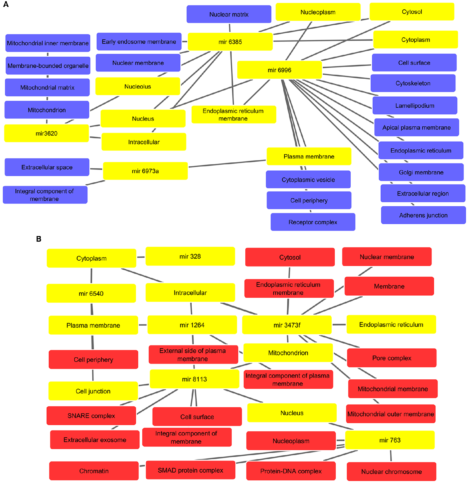 (A) Associated cellular components of up regulated miRNAs with interlinked miRNAs and their respective key cellular compartments highlighted with yellow color such as nucleoplasm, cytoplasm, and intracellular, etc. (B) Cellular components inferred from analysis of down regulated miRNA-targets. The highlighted yellow color denotes interlinked miRNAs and their respective key cellular components like cytoplasm, plasma membrane, mitochondrion, and cell junction, etc.