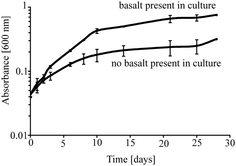 Elevated growth under Fe-limited conditions in the presence of basaltic glass (Figure 1) suggests that the Fe supplied from the basalt is used by cells either as a nutrient and/or energy source. Based on diffusion chamber experiments, either direct attachment or at least physical proximity of cells to the glass surface is critical in this process (Figure 2).